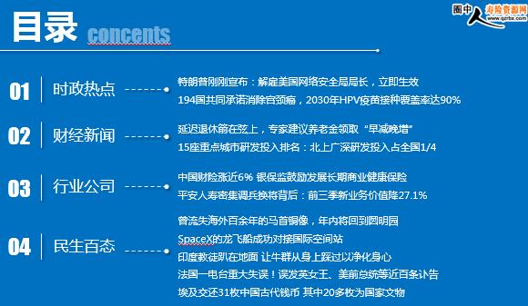 每日新闻速递 2020年11月19日 星期四 目录 时政热点 财经新闻 行业公司 民生百态 特朗普刚刚宣布:解雇美国网络安全局局长,立即生效 194国共同承诺消除宫颈癌,2030年HPV疫苗接种覆盖率达90% 延迟退休箭在弦上,专家建议养老金领取“早减晚增” 15座重点城市研发投入排名:北上广深研发投入占全国1/4 中国财险涨近6% 银保监鼓励发展长期商业健康保险 平安人寿密集调兵换将背后:前三季新业务价值降27.1% 曾流失海外百余年的马首铜像,年内将回到圆明园 SpaceX的龙飞船成功对接国际空间站 印度教徒趴在地面 让牛群从身上踩过以净化身心 法国一电台重大失误!误发英女王、美前总统等近百条讣告 埃及交还31枚中国古代钱币 其中20多枚为国家文物 时政热点 特朗普刚刚宣布:解雇美国网络安全局局长,立即生效 2020-11-18 07:51:33 来源:北京日报 当地时间17日,美国总统特朗普发推宣布,美国网络安全与基础设施安全局局长克里斯托弗克雷布斯(Chris Krebs)被解除职务,立即生效。 194国共同承诺消除宫颈癌,2030年HPV疫苗接种覆盖率达90% 2020年11月18日 08:37:34 来源:北京晚报 世卫组织17日发布《加速消除宫颈癌全球战略》,全球194个国家首次承诺消除一种癌症。战略设定2030年HPV疫苗接种覆盖率达90%、筛查覆盖率达70%以及宫颈癌前病变和宫颈癌治疗可及性达90%。宫颈癌是发病率仅次于乳腺癌的女性恶性肿瘤。共同行动,为了没有宫颈癌的未来。