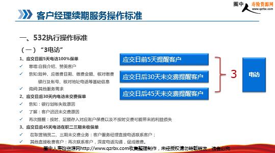 续期作业操作标准化 课程目标 为了提升续期管理专业化水平,通过规范服务营销续期作业操作标准,实现续期指标持续优化,引导服务营销队伍健康、持续、稳健发展,特制定本手册。 续期业务管理是公司长期稳健经营根本,内涵价值体现;是上市公司公司核心经营指标。 课程导入 思考:为什么要做好续期服务? 续期服务,决定你的未来! 课程导入 课程导入 ClicktoaddText ClicktoaddText ClicktoaddText 服务到位 管控到位 责任到位 续期 中支内勤 复杂的事情简单做,你就是专家;简单的事情重复做,你就是行家;重复的事情用心做,你就是赢家! 一、532执行操作标准(一)“3电访” 1、应交日前5天电访100%保单寒喧:自我介绍、赞美客户告知:险种、应缴费日期、缴费金额、核对缴费银行及帐号、核对地址电话等基础信息询问:其他服务需求 2、应交日后30天内电访未交费保单告知:银行划帐失败原因了解:客户迟迟未交费原因再次提醒:按时、足额存入对应账户保费以及不按时交费可能带来的利益损失 3、应交日后45天电访在职二三期未收保单在职营销员二、三期未交费业务:客户服务经理直接电话联系客户;其他直接收费客户:再次联系客户,深度电话沟通,促成缴费。客户经理续期服务操作标准 电访 应交日后30天未交费提醒客户 应交日前5天提醒客户