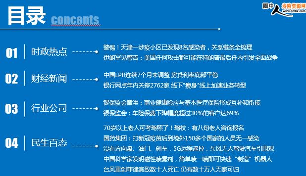 每日新闻速递 2020年11月21日 星期六 目录 时政热点 财经新闻 行业公司 民生百态 时政热点 警惕!天津一涉疫小区已发现8名感染者,关系链条全梳理 伊朗罕见警告:美国任何攻击都可能在特朗普最后任内引发全面战争 中国LPR连续7个月未调整 房贷利率底部平稳 银行网点年内关停2762家 线下"瘦身"线上加速业务转型 银保监会黄洪:商业健康险应与基本医疗保险形成互补和衔接 银保监会:车险保费下降幅度超过30%的客户达69% 70岁以上老人可考驾照了!驾校:有八旬老人咨询报名 国药集团:打新冠疫苗后到境外150多个国家的人员无一感染 没有方向盘、油门、刹车,5G远程遥控,东风无人驾驶汽车引围观 中国科学家发明磁性喷雾剂,简单喷一喷即可快速“制造”机器人 台风重创菲律宾致数十人死亡 仍有数十万人无家可归 时政热点 警惕!天津一涉疫小区已发现8名感染者,关系链条全梳理 2020-11-20 07:51:33 来源:北京日报 11月20日凌晨,天津报告新增4例本土确诊,均来自东疆港区瞰海轩小区。至此,该小区已经发现5例确诊病例和3例无症状感染者。 11月10日,居住在东疆港区瞰海轩小区一居民王某某,被确定为天津本土第3例无症状感染者。此后短短10天内,该小区又有7人接连被检出核酸阳性,他们有的是王某某的工友、有的是其同住一小区的居民。 伊朗罕见警告:美国任何攻击都可能在特朗普最后任内引发全面战争 2020年11月20日 08:37:34 来源:国际连连看 伊朗最高领袖哈梅内伊(Ayatollah Ali Khamenei)的一名顾问表示,美国的任何攻击都可能在特朗普总统任期的最后几周引发一场“全面战争”。 侯赛因•德汗在接受美联社采访时表示,“一场有限的战术冲突可以变成一场全面的战争,”“毫无疑问,美国、该地区和世界无法承受这样一场全面的危机。”