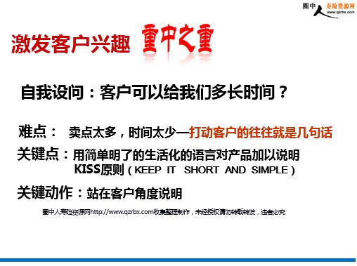 中高端客户营销 营销流程 一、准备 (一)观念(二)客户背景(三)营销规划 一个勇于突破自我的人,应该勇于打破自己的固有认识和观念!突破观念 1、片面的保险理财定律阻隔了思维的突破保险双十定律: 10%的收入购买10倍收入的保障保险先买大人后买孩子,先买家庭支柱再买家庭其他成员! 保险需求是多样化和多变化的,不能一层不变的恪守那些陈旧的观念和所谓的理论,客户的需求受家庭结构、教育水平、收入水平影响。 突破观念 2、保险就是保障!保障只是保险最微小的部分!保险公司占世界500强企业10% 保险公司营业收入占世界500强企业10% 保险资产占世界500强企业总资产的17% 保险资金运用占世界金融投资的40% 保险公司本质上是金融公司金融公司的本质就是融资与投资高端客户一定看重的是能提供大量准备金的产品 寿险责任准备金是保险公司资金运用的最大来源 任何公司的壮大,不是规模多么大、成长多么迅速;而是抗过多少灭顶之灾! 突破观念 3、高端客户就是年收入达到****¥赚收入的只能是中端客户,做企业的才能算高端客户。收入的概念更趋向稳定工资,做企业的人只给别人发工资,自己只有账面利润。 赚收入的中端客户和做企业的高端客户的思维模式是截然不同: 赚收入的人更注重资金运用的收益性做企业的人更关注资金运用的安全性中端客户用收入买保险高端客户用资产买保险 给高端客户推荐10万的保费无疑是对自己的最大侮辱 1、高端客户一掷千金给孩子买的礼物都是以百万计的豪华轿车 2、高端客户购买10万的保费和白领买张IPA没有本质的区别 3、高端客户只有对连他们都承受不起的保费抬抬眼,才会正视保险。 突破观念 4、你看你给自己的企业和家庭资产隔离一下,或者给儿子资产传承一下,买个10万怎么样? 资产型保险再认知 你是否认同—— 突破资产型保险产品销售,将铸造你未来成功理财之路 据统计,人一生患重大疾病的概率是72.8%,所以我们非常需要为身体购买一份保障型险种! 你是否认同—— 美国中小企业平均寿命不到7年,大企业平均寿命不足40年。而中国,中小企业的平均寿命仅2.5年,集团企业的平均寿命仅7-8年。美国每年倒闭的企业约10万家,而中国有100万家,是美国的10倍。 ——摘自美国《财富》杂志