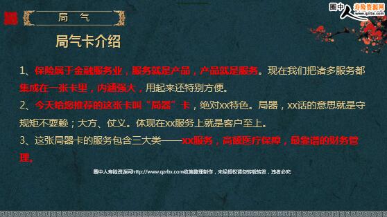 局气 1、保险属于金融服务业,服务就是产品,产品就是服务。现在我们把诸多服务都集成在一张卡里,内涵强大,用起来还特别方便。 2、今天给您推荐的这张卡叫“局器”卡,绝对xx特色。局器,xx话的意思就是守规矩不耍赖;大方、仗义。体现在xx服务上就是客户至上。 3、这张局器卡的服务包含三大类——xx服务,高额医疗保障,最靠谱的财务管理。 局气卡介绍 一、xx服务 1、专家挂号服务:xx32家三甲医院,您可以根据需要指定医院、指定科室,我们承诺在7个工作日内挂上副主任医师及以上级别的专家号,让您不耽误就诊。 2、专业的陪诊服务:我们对医院的环境比较陌生,楼上楼下跑,还经常找不着地方,有了专业的陪诊服务,他就可以带着您走完全部就诊流程,省心又省力,心里特别踏实。 3、这个服务您本人可以三年内无限次使用。您的三位直系亲属还可以使用,只不过他们是每年一次。 xx好医院很多,但挂号特别费劲,看病拖时间太长。有了局器卡这些都不是事儿,我们这部分服务有三项。 1、这张卡为您提供15年住院医疗费用的报销,即使上一年生病发生理赔,不管报销多少,下一年保障都还会继续有效。 2、因意外或疾病住院都可以报销,每年100万的报销额度。因55种特定轻症疾病住院,每年200万的报销额度。因105种重大疾病住院,每年400万的报销额度,前两项有一万免赔额,重大疾病住院没有免赔额。 3、如果平平安安,没发生理赔,保额会逐年增长。一般医疗保险金额可最高增到200万,轻症医疗保险金可最高增到300万,重疾医疗保险金可最高增到500万。 4、住院期间发生必要且合理的费用都可以报销,包括列明的检查费、治疗费、床位费、加床费、膳食费、手术费、材料费、护理费、会诊费和救护车费。不仅如此,像质子重离子治疗、肿瘤靶向治疗、肿瘤免疫治疗都可以报销、让我们用上更先进的药物和治疗技术。 二、高额住院保障服务 5、如果因重症进入ICU,可以每天补贴1000元,最高补贴30天。 6、人工肺ECMO,就是治疗重症新冠病人最有效医疗手段,如果住院用到这个器材,每天还可以补贴1000元,可以给到30天。补贴与医疗报销不冲突,能重复兼得。可有效补充重症治疗支出。在疫情仍在反复的情况下,这是非常必要的保障。 7、责任范围内的医疗费用,公司可以先垫付,而后在进行报销,可以帮助我们更好地解决大额医疗费用的压力。 8、院后服务,出院前将由专业的医疗团队上门评估,出院当日还会有交通安排及陪护,我们还会给出院后居家照护指导建议,并且安排远程居家照护指导。