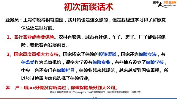缘故客户经营面谈技巧及话术 课程大纲 缘故初次面谈技巧 缘故初次面谈话术 缘故初次面谈 建立良好的第一印象,并通过与准客户的沟通(面谈)发现准客户的保险需求,寻找购买点,顺利争取进一步面谈的机会。 1、拉近距离,产生共鸣 2、建立信任,收集资料, 3、挖掘需求,激发购买 一、初次面谈的目的 二、初次面谈的步骤 一定给客户留下美好印象! 初次面谈的过程中,首先推销的是你自己,其次才是保险。 1、自我介绍(公司、自己、介绍人) 寒暄就是与客户聊天,聊出亲切感向对方表达支持性的语言表达自己的专业形象,产生信赖 2、寒暄 常用支持性语言 当对方情况良好时,赞美他:真不简单… 您工作这么忙,还给小孩辅导功课,真不简单 当对方情况普通时,肯定他:看得出来… 看得出来,您是一个有爱心的人 当对方情况不佳时,安慰他:那没关系,我知道你已经尽力了 3、收集资料 基本资料: 年龄、配偶、子女、健康状况、收入及财务状况等 性向资料:性格特征、个人兴趣、成就。 现有福利保障及投资规划 ——根据信息资料引导购买点 4、切入保险 意外保障 健康医疗 养老规划 子女教育 投资理财 三、初次面谈的技巧 赞美——赢得好感,贯穿销售始终倾听——认真聆听,让对方多说提问——引发客户思考(收集客户资料和切入保险) ...........