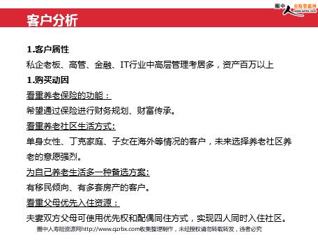 养老社区客户脸谱识别及邀约话术集锦 客户脸谱识别 客户购买分析 邀约话术集锦 **先生年龄:40岁选择养老社区的理由:我是一个民营企业家,在打拼已有十几年。已有一定的经济基础,可父母还在家乡三线城市,现既想把父母接到大城市养老,又想保持双方的生活独立性,所以我选择养老社区。医疗和生活上都有保证。 客户脸谱1:异乡创业型 客户脸谱2:子女海外型 **女士年龄:64岁选择养老社区的理由:我的孩子常年在美国工作,我和老伴又不愿移民过去,怕不适应国外的环境。现在我们生活还能自理,再过几年就不好说了,虽然子女给我们请了保姆,但还是觉得生活质量不高。养老社区里的老年生活安排的很丰富精彩,和生活背景差不多的同龄人在一起不会觉得孤单。这样孩子在国外也安心。客户脸谱3:商机拓展型 **先生年龄:47岁职业:某上市公司高管相比居家养老和普通养老院养老,高端养老社区兼具社会性和安全性,而且社区居民都是各行业、各领域的精英人士,能满足我交流的需要,相当于住进了一所大学,生活在几百人的智囊团中,我个人而言我是边发展、边锁定,通胀问题保险公司给我兜底,花钱住进这样的社区感觉投资有回报。客户脸谱4:父母护理型 **女士年龄:44岁我的母亲是位老年痴呆症患者。现在还处于临床诊断的第一阶段,不能独立购物,对时间和数字认知有障碍,日常生活离不开家人的陪伴和照顾。我平时工作太忙,请的家政人员都不专业。现在买了高端的养老社区产品,我母亲的终于可以有专业的医疗护理机构照顾了。客户脸谱5:二人世界恩爱型 **先生年龄:52岁选择养老社区的理由:我们家是丁克家庭,我和妻子没有养育子女,所以要趁现在安排好自己的晚年生活。我期望的老年生活是自由、活力和高品质的,既有朋友陪伴又保持自己生活的私密性。高端的养老社区正好符合我对养老的需求。客户脸谱识别