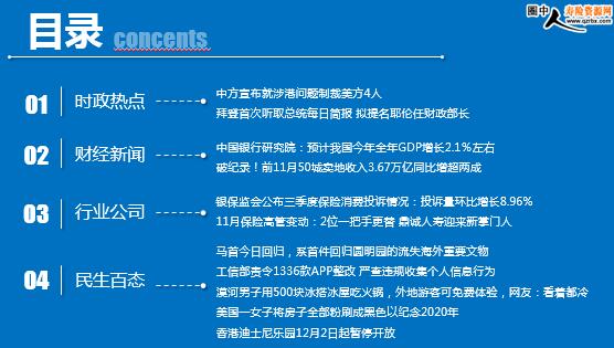 每日新闻速递 2020年12月2日 星期三 目录 时政热点 财经新闻 行业公司 民生百态 时政热点 中方宣布就涉港问题制裁美方4人 拜登首次听取总统每日简报 拟提名耶伦任财政部长 中国银行研究院:预计我国今年全年GDP增长2.1%左右 破纪录!前11月50城卖地收入3.67万亿同比增超两成 银保监会公布三季度保险消费投诉情况:投诉量环比增长8.96% 11月保险高管变动:2位一把手更替 鼎诚人寿迎来新掌门人 马首今日回归,系首件回归圆明园的流失海外重要文物 工信部责令1336款APP整改 严查违规收集个人信息行为 漠河男子用500块冰搭冰屋吃火锅,外地游客可免费体验,网友:看着都冷 美国一女子将房子全部粉刷成黑色以纪念2020年 香港迪士尼乐园12月2日起暂停开放 时政热点 中方宣布就涉港问题制裁美方4人 2020-11-30 16:35 来源:中国新闻网 中国外交部发言人华春莹30日在北京说,针对美方错误行径,中方决定对在涉港问题上表现恶劣的“美国国家民主基金会”亚洲事务高级主任约翰•克瑙斯,“美国国际事务民主协会”亚洲项目负责人阿南德、香港分部主管罗萨里奥、项目主任薛德敖等4人实施制裁。 拜登首次听取总统每日简报 拟提名耶伦任财政部长 2020-12-1 15:33:22 来源:中国新闻网 当地时间11月30日,美国当选总统拜登首次听取了总统每日简报(PDB),意味着其入主白宫的进程迎来新阶段。同日,拜登宣布,拟提名珍妮特•耶伦(Janet Yellen)出任财政部长。如果提名获参议院通过,耶伦将成为美国历史上首位女性财政部长。