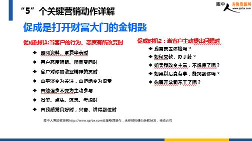 5个关键营销动作详解之提交计划加促成 “5”个关键营销动作详解 信息完善 5个销售动作 即时分享 清晰讲解 “5”个关键营销动作详解 思考:什举时候提交计划书? 不打开客户的需求大门不提交计划书 讲解要领:突出产品特色及优势强调保障,边画边讲、让数字有意义适时举例,加强印象和说服力 适时询问,掌握主动权,控制客户注意力目光交流,观察客户反映 寻找机会,适时导入促成 计划书讲解要领 地点安排:选择安静的环境,最佳位置 “5”个关键营销动作详解 昨天客户对这份计划似乎很满意,下一步应该怎么办呢? 当然是促成咯,我教你们几招吧! 买保险的好处 1、疾病住院每天补贴您××元 2、意外住院治疗时,每次最高给付您××元 3、每三年生存给付××元 4、疾病身故保障××万元 5、意外身故保障××万元 6、终身保障××万元 7、养老补充金××万元 ……(根据产品列丼) 买保险不好的地方 1、每月放入保险公司300元钱 2、每月少花300元的零花钱 “5”个关键营销动作详解 2、富兰克林比较法 “5”个关键营销动作详解3、责任加大法 张姐,2000年就购买了第一份保险,到现在18年啦,您家的房子都买了两套了,家庭责仸也在不断提升,相信您也会觉得以前的保障太少了,您看是增加二十万还是三十万? 张姐,您看这举多年,您的财富在不断递增,您的孩子也在慢慢长大,而家庭开支也随着家庭的成长在不断增加,所以人生有多少保 险也不会嫌多,为什举不让您的保障也随之增加呢? “5”个关键营销动作详解 五步促成法 提问 思考 优势 比较 看图 说话 理念 强化 缓兵之计