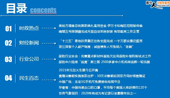 每日新闻速递 2020年12月4日 星期五 目录 时政热点 财经新闻 行业公司 民生百态 时政热点 美检方调查总统就职典礼滥用资金 伊万卡和梅拉尼娅被传唤 嫦娥五号探测器完成月面自动采样封装 有效载荷工作正常 “十三五”易地扶贫搬迁任务全面完成 一千万群众搬迁脱贫 浙江探索个人破产制度:诚信债务人可免纳入“老赖” 保险行业协会:完善重点新材料首批次应用保险补偿机制试点工作 保险中介陆续“逃离”新三板 2500多家中介机构将迎新一轮洗牌 2021年元旦火车票今日开售 离婚冷静期实施条款出炉:30天冷静期后须双方同时领离婚证 中国广电:未来5G手机可免费接收电视节目 华春莹:中国向美出口的口罩,平均每个美国人将获得约120个 世界气象组织:2020年将成为有记录以来最暖年份之一 时政热点 美检方调查总统就职典礼滥用资金 伊万卡和梅拉尼娅被传唤 2020年12月03日 05:31 来源:海外网 美国检方近期就特朗普2017年就职典礼滥用资金一案进行调查,并传唤了特朗普的女儿伊万卡和第一夫人梅拉尼娅。 据美国有线电视新闻网(CNN)2日报道,一份法庭文件显示,伊万卡于1日向华盛顿哥伦比亚特区总检察长办公室的调查人员提供了证词。作为诉讼的一部分,总统就职典礼委员会主席汤姆•巴拉克也于11月17日作证。这份法庭文件称,调查人员还传唤了梅拉尼娅和就职委员会前副主席里克•盖茨,以及特朗普竞选团队的托马斯•巴拉克。 嫦娥五号探测器完成月面自动采样封装 有效载荷工作正常 2020-12-3 15:33:22 来源:环球网 记者从国家航天局获悉,12月2日22时,经过约19小时月面工作,探月工程嫦娥五号探测器顺利完成月球表面自动采样,并已按预定形式将样品封装保存在上升器携带的贮存装置中。