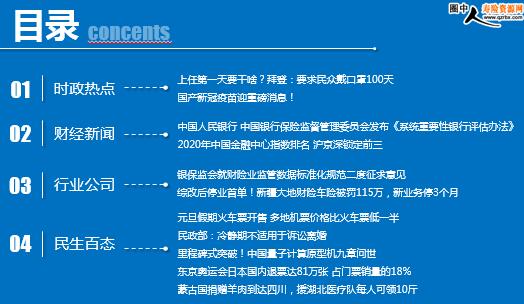 每日新闻速递 2020年12月5日 星期六 目录 时政热点 财经新闻 行业公司 民生百态 时政热点 上任第一天要干啥?拜登:要求民众戴口罩100天 国产新冠疫苗迎重磅消息! 中国人民银行 中国银行保险监督管理委员会发布《系统重要性银行评估办法》 2020年中国金融中心指数排名 沪京深锁定前三 银保监会就财险业监管数据标准化规范二度征求意见 综改后停业首单!新疆大地财险车险被罚115万,新业务停3个月 元旦假期火车票开售 多地机票价格比火车票低一半 民政部:冷静期不适用于诉讼离婚 里程碑式突破!中国量子计算原型机九章问世 东京奥运会日本国内退票达81万张 占门票销量的18% 蒙古国捐赠羊肉到达四川,援湖北医疗队每人可领10斤 时政热点 上任第一天要干啥?拜登:要求民众戴口罩100天 2020年12月04日 05:31 来源:海外网 “只需戴100天,并非永久戴。我想到时候我们会看到新冠病例明显减少。”美国当选总统拜登周四(3日)接受美国有线电视新闻网(CNN)采访时表示,计划在就职当天要求公众戴口罩至少100天。 拜登在采访中还称,美国民众已经对疫苗失去了信心,总统和副总统的所作所为很重要。他表示,一旦福奇宣布新冠疫苗安全性,他就会乐于获得疫苗,乐于让公众获得疫苗。“到时候,我会在公众面前接种疫苗。” 国产新冠疫苗迎重磅消息! 2020-12-4 15:33:22 来源:每日经济新闻 据长江日报,今天(12月4日),科研攻关组疫苗研发专班专家组副组长、中国工程院院士王军志在第八次世界中西医结合大会做《新冠肺炎疫苗和药物研发进展》发言时表示,“年内将有6亿支灭活疫苗获批上市。” 王军志介绍,截至12月2日,全球在研疫苗共有214个。其中51个已进入临床研究(中国14个),进入三期临床的有14个(中国6个)。而中国进入三期临床的6支疫苗,其中4支为灭活疫苗。