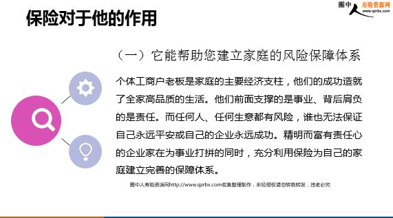 个体商户客户经营技巧 个体工商户保险客户群体,是我们只要的客户群体,他们对保险需求大,且更容易追踪营销,是开门红的主攻客户群。 个体工商户保险客户特点: 1、经常在自己的店里,容易追踪 2、长期做生意,有较多积蓄 3、理财需求大 4、对意外保险及健康险需求大 5、客户圈大 6、容易转介绍 如何营销个体工商户,如何抓住这些客户需求点?? 对于这类客户,往往有较多的需求点: 抓住他们的需求点是成功的关键 1、工作性质带来的安全问题产生的意外保险需求; 2、下面员工的保险需求; 3、财产保险等 (一)它能帮助您建立家庭的风险保障体系 个体工商户老板是家庭的主要经济支柱,他们的成功造就了全家高品质的生活。他们前面支撑的是事业、背后肩负的是责任。而任何人、任何生意都有风险,谁也无法保证自己永远平安或自己的企业永远成功。精明而富有责任心的企业家在为事业打拼的同时,充分利用保险为自己的家庭建立完善的保障体系。 保险对于他的作用 即使自己发生不幸或生意遭遇失败,仍然能保证家庭的生活品质不会有明显的下降,从而为自己免除了后顾之忧,以便全身心投入到事业中去。保险虽然不是最好的投资工具,但它可以为您的事业保驾护航! (2)保险能帮助您建立家庭的风险保障体系 保险对于他的作用