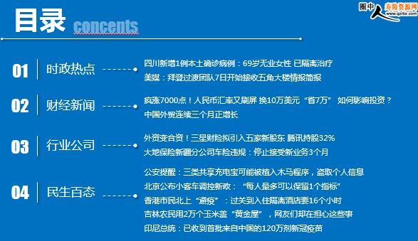 每日新闻速递 2020年12月8日 星期二 目录 时政热点 财经新闻 行业公司 民生百态 时政热点 四川新增1例本土确诊病例:69岁无业女性 已隔离治疗 美媒:拜登过渡团队7日开始接收五角大楼情报简报 疯涨7000点!人民币汇率又刷屏 换10万美元“省7万” 如何影响投资? 中国外贸连续三个月正增长 外资变合资!三星财险拟引入五家新股东 腾讯持股32% 大地保险新疆分公司车险违规:停止接受新业务3个月 公安提醒:三类共享充电宝可能被植入木马程序,盗取个人信息 北京公布小客车调控新政:“每人最多可以保留1个指标” 香港市民北上“避疫”:过关到入住隔离酒店要16个小时 吉林农民用2万个玉米盖“黄金屋”,网友们却在担心这些事 印尼总统:已收到首批来自中国的120万剂新冠疫苗 时政热点 四川新增1例本土确诊病例:69岁无业女性 已隔离治疗 2020年12月07日 05:31 来源:环球网 12月7日,郫都区新增1例新冠肺炎确诊病例。患者卢某某,女,69岁,无业,居住于郫筒街道太平村11组。12月6日,因咳嗽、咳痰等症状,前往郫都区人民医院就诊。入院体温36.2℃,肺部CT显示双肺散在分布磨玻璃影。12月7日,经市疾控中心复核新冠病毒核酸检测阳性。经省、市、区专家会诊,综合临床、影像学表现和实验室核酸检查结果,诊断为确诊病例(普通型),已转运至成都市公共卫生临床医疗中心医院隔离治疗。 美媒:拜登过渡团队7日开始接收五角大楼情报简报 2020-12-7 15:33:22 来源:海外网 当地时间6日,美国国防部官员透露,当选总统拜登的过渡团队将于周一(当地时间7日)开始接收来自五角大楼情报机构的简报。 据美国《国会山报》报道,一名美国防部高级官员透露,拜登过渡团队将于7日和8日与美国防部情报机构方面会面。