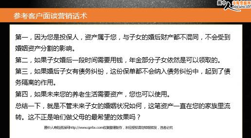 风险三 婚嫁金被子女婚后消费无 度,导致财产被挥霍的风险 风险二 婚后共同债务,导致婚前 财产被用于偿债的风险 风险一 婚后资产混同,导致婚前 财产被分割的风险 婚嫁金存在的风险 结婚后资产改姓 共同了 离婚时资产一人 分一半 【《婚姻法》第十七条规定】 夫妻在婚姻关系存续期间所得的下列财产,归夫妻共同所有: (一)工资、奖金; (二)生产、经营的收益; (三)知识产权的收益; (四)继承或赠与所得的财产,但本法第十八条第三项规定的除外; (五)其他应当归共同所有的财产。 夫妻对共同所有的财产,有平等的处理权。 结了婚以后 你的钱就是我的钱 我的债也是你的债 兴家犹如针挑土 败家好似浪淘沙 年金保险是父母给子女婚姻最好的安排 不怕婚姻风险 给你重新选择的勇气和信心 不怕债务风险 给你东山再起的机会和资本 不怕挥霍风险 让你无法挥霍又能细水长流 适用年金优势:稳定的现金流婚姻、债务隔离 参考客户面谈营销话术 儿女结婚了,就要自己安排自己的生活了,您那么疼孩子,一定会提前帮孩 子安排好了未来的生活规划,对吧? 您给儿女的这笔钱一定是希望能够照顾儿女的生活,但是您知道吗?如果这 笔钱安排的不合适,可能会导致本应属于儿女的钱因为各种情况而流失。我的 一个朋友就曾经遇到过这样的问题…… 他的女儿结婚的时候也是给了女儿一大笔嫁妆,后来因为女婿经商的过程 中,因为经营不慎导致企业破产,负债累累。后来,法院居然把朋友女儿的个 人账户给冻结了,并且用于偿还债务。 第通逻辑参考客户面谈营销话术 三板块:参考面谈沟 我的朋友觉得女婿经商欠债怎么也不能影响到女儿的婚前财产,咨询了律师 才发现还真的会影响。虽然钱是婚前的,但是婚后的债务是共同的,作为女方 有连带偿还的责任,导致最后给女儿的嫁妆全部拿去偿债了。