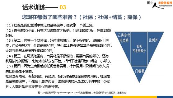 产品组合销售 思路及重疾六问 ③您现在都有什么准备? 话术训练—— 03 (1)社保是我们生活中常见的基础保障,他就像一个倒三角。(2)首先有起付线,只有达到该额度才报销。门诊1800起报,住院1300起报。(3)第二,它有一个封顶线,超过该额度以上是不报销的。城镇职工医疗,门诊最高2万,住院最高30万。其中基本医保统筹基金最高限额10万,大额互助资金最高支付限额20万。(4)第三,在可报范围内,自费药是不报销的,需要自费的部分。还有就是按比例报销,比例外的部分也不管。相当于社保只管中间这一小部分。(5)第四,因为生病引起的任何营养费用,疗养费用以及期间的收入损失社保都是不管的。社保是有限制、有起付线、有封顶、按比例报销社保目录内用药,社保是最基础的保障,不是包!总体而言,医保解决的只是医疗开销中的一小部分,大部分都是需要商业保险来补充。 您现在都做了哪些准备?(社保;社保+储蓄;商保) ④发生风险后的损失有哪些? 话术训练—— 04