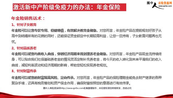 “新中产阶级” 年金保险营销小策略 吴晓波频道在2018年发布的《2018新中产白皮书》中从价值观、经济、职业和教育四个维度对新中产做了界定。从价值观层面上和教育层面看,“新中产”普遍接受了高等教育,拥有大学本科或大学专科以上学历的比例超过90%。同时拥有较为健康的价值观,这群人有一定的精神需求,在文化艺术、休闲放松、社交应酬等方面“舍得消费”。从经济和职业层面看,他们没有生来富足,也没有一夜暴富,他们工作兢兢业业,他们在用时间和耐心换来人生的蜕变和跨越。 这类人,拥有学识、情怀,会奋斗、拼搏,同时也充斥着各类的需求。 哪些人属于新中产? 新中产最大的职业诉求是自我实现,希望有更宽广的施展平台、符合前沿趋势的行业、更丰厚的薪酬。面对竞争压力,中产者要不断提升能力来保证自己的竞争力。 一、事业的瓶颈 二、生活的质量 新中产通过工作成绩收获了享受高品质生活的权利。但他们对美好生活的选择,既有欲望也有恐惧。为了防止自己在落后于社会的发展,需要通过不断的消费维护自己现有的生活方式。在他们不断努力工作得到所需,白天高效为劳动契约勤奋工作;晚上则需要寻求感官刺激来释放压力,每个夜晚,城市中产者忙碌工作暂时结束后,就开始寻求内心世界的放松。 面对不稳定的市场环境,对收益的期许和投资风险的存在给新中产带来了强烈的不安全感。 三、投资的保证 新中产的焦虑源自于对未来的不可预知。 年金险产品具有: 规划自主、支配灵活、关爱终身、周转便捷等 诸多特色设定 年金险销售话术: 1、针对子女教育 年金险可以让您专款专用、稳健增值,有效解决教育金储备。对您而言,年金险产品在提前规划好孩子从高中到结婚所有的花销的同时,还能保证资金锁定中长期较高利益,让您一旦持有,子女教育问题再也无忧。