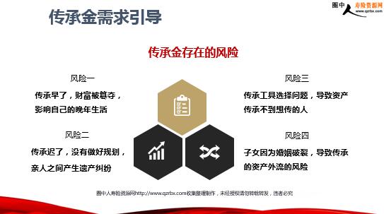 年金险销售场景解析 —传承金 目录 年金险的特点与优势年金险的功用 传承金需求引导传承金面谈话术传承金保单设计 赡养父母无忧06 新形势下客户财富目标 1、保险期间一般以年度为时间节点,可以为客户提供一笔长期稳定的现金流,满足客户需求。 2、年金保险返还金额的多少,一般与投保的保额成正比例关系,一旦投保可以锁定收益,无惧市场变动。 3、多数年金保险除了固定收益外,通过附加万能账户提升收益,同时通过附加万能账户,可以将年金变相转给投保人。 4、具有强制储蓄的功能,达成家庭重要财富目标的有利工具。 5、高现价灵活使用保单资金,低现价有利于风险资产的保护。 年金保险的特点与优势 1、作为客户给子女的教育基金,防止债务以及婚姻的影响 2、作为客户给子女的婚前财产,防止婚后被共同财产混同 3、作为给客户自己的养老基金,防止法律风险以及被篡夺 4、作为客户给子女的传承资产,防止子女挥霍以及被篡夺 年金保险的功用 年金险满足客户需求 客户要的是解决人生各个阶段的风险问题,年金保险就是解决这些风险的金融工具。 成长无忧 婚姻不愁 老有所养 传承有方 目录 年金险的特点与优势年金险的功用 传承金需求引导传承金面谈话术传承金保单设计 传承金需求引导 传承金存在的风险 传承早了影响晚年生活 传承金需求引导 传承晚了影响亲人感情