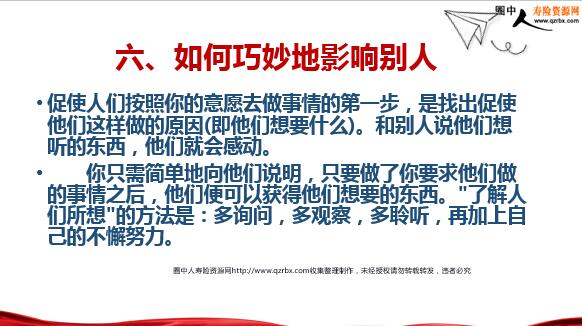 学技巧用技巧业绩一定好 了解人和人性 提高人际交往和掌握成功的人际关系技巧的第一步是:正确地了解人和人的本性。了解人和人性可简单概括为--"按照人们的本质去认同他们","设身处地认同人们",而不要用自己的眼光去看待别人,更不要把自己的意志强加于别人。人首先是对自己感兴趣,而不是对你感兴趣!换句话说--一个人关注自己胜过关注你一万倍。认识到"人们首先关心的是自己而不是你"这一点,是生活的关键所在。 二、如何巧妙地与别人交谈 当你与人交谈时,请选择他们最感兴趣的话题。他们最感兴趣的话题是什么呢?是他们自己!把这几个词从你的词典中剔除出去--"我,我自己,我的"。用另一个词,一个人类语言中最有力的词来代替它――"您"。你是否对谈话感兴趣并不重要,重要的是你的听众是否对谈话感兴趣。当你与人谈话时,请谈论对方,并且引导对方谈论他们自己。这样你就可以成为一名最受欢迎的谈话伙伴。 三、如何巧妙地令别人觉得重要 人类一个最普遍的特性便是--渴望被承认,渴望被了解。你愿意在人际关系中如鱼得水吗?那么,请尽量使别人意识到自身的重要性。请记住,你越使人觉得自已重要,别人对你的回报就越多。三、如何巧妙地令别人觉得重要 1.聆听他们 2.赞许和恭维他们 3.尽可能经常地使用他们的姓名和照片 4.在回答他们之前,请稍加停顿 5.使用这些词--"您"和"您的" 6.肯定那些等待见你的人们 7.关注小组中的每一个人 四、如何巧妙地赞同别人 绝对不要忘记任何愚人都可以反对别人,而只有智者和伟人才会赞同--尤其当对方犯错误时!"赞同艺术"可概括为以下6点: 1.学会赞同和认可 2.当你赞同别人时,请说出来 3.当你不赞同时,千万不要告诉他们,除非万不得已 4.当你犯错时,要勇于承认 5.避免与人争论 6.正确处理冲突 五、如何巧妙地聆听别人 聆听越多,你就会变得越聪明,就会被更多的人喜爱,就会成为更好的谈话伙伴。当然,成为一名好的听众,并非一件容易的事,这里我有5点建议可供参考:五、如何巧妙地聆听别人 1.注视说话人 2.靠近说话者,专心致志地听 3.提问 4.不要打断说话者的话题 5.使用说话者的人称--"您"和"您的"六、如何巧妙地影响别人 促使人们按照你的意愿去做事情的第一步,是找出促使他们这样做的原因(即他们想要什么)。和别人说他们想听的东西,他们就会感动。你只需简单地向他们说明,只要做了你要求他们做的事情之后,他们便可以获得他们想要的东西。"了解人们所想"的方法是:多询问,多观察,多聆听,再加上自己的不懈努力。