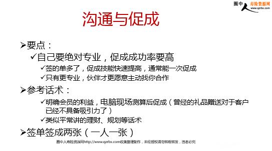 乘风破浪 合作营销赢未来 我的心路历程 问题的发现 优质客户资源日渐枯竭自己的老客户亟需资源再开发新人(部分伙伴)客户开发能力弱 我的做法 寻找新的出路——合作共赢 我的感受: 自己财富升级,且带动一批人共同致富 合作营销给我带来的收获 x年成交保单506件,合作营销占比达90% 个险长期合作伙伴10人,银保渠道合作伙伴4人合作营销日签个单最高纪录12件 我的观念 严格执行合作营销的制度,让更多人愿意与你合作 正确看待利益分配要有好的人品正确看待两个人的功劳发掘每个人的优势合作营销就是通过团队发展业务,和谐发展具体做法 建立合作关系电话邀约接洽沟通与促成递送保单客户服务与经营 建立合作关系 “三问”确认能否合作合作者与客户是何关系接触了多长时间是否买过保险商量邀约的话术并现场演示安排接洽环节(角色分配,包装话术,见面场景)电话邀约 要点用自己的手机打让客户到公司来参考话术 “您好,今天公司安排我打电话给您,是因为您在我们公司购买过保险,目前公司针对老客户进行会员(老客户)利益大派送活动,明天无论如何一定要到我们公司来,带上您的保单、银行卡和身份证,办理手续”,我在公司三楼的***办公室等您。话术精髓:用客户的利益,强调无论如何都要见面 接洽 要点见面时的场景安排安排在公司见面,感受公司的氛围 1、有安排大厅,假装偶遇;2、安排到办公室;3、也有直接在会场 A+B互相包装合作伙伴包装:强调杨总亲自接待(位置、身份)展业工具自我包装:(报纸、宣传资料等)沟通与促成 要点:自己要绝对专业,促成成功率要高签的单多了,促成技能快速提高,通常能一次促成只有更专业,伙伴才更愿意主动找你合作参考话术:明确会员的利益,电脑现场测算后促成(曾经的礼品赠送对于客户已经不具备吸引力了)类似平常讲的理财、规划等话术签单签成两张(一人一张)沟通与促成