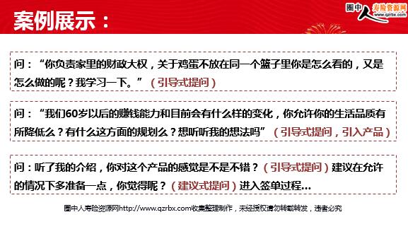 一听二问,轻松”切入”保险 我的感悟与目标 1.跟客户说什么都行,只要一提到保险就谈不下去了; 2.给客户讲了半天,一点反应都没有,就说没钱,过段时间再说,继续不入了保险话题。 你是否经历过? 转介绍 1.有效地倾听 2.针对性地提问 签单并不难,难的是找到通向客户心灵的路径。 听:耐心的聆听,听客户把话讲完 听 不打断不评价不推销不反驳 听:听对方的顾虑和真实需求 倾听时提炼对方的意图 听 提问和倾听通常是相辅相成的,提出针对性的问题,才能获得有价值的信息。 当客户没有保险意识,且话题不涉及保险,通过讲故事提问题,切入保险话题。 我曾在一则财经节目中,看到主持人问嘉宾会不会配置保险,有的人说会,有的人说不会,节目结束时,主持人说了一段话,一个家庭配不配置保险取决于家庭这艘大船是否具备抵抗风浪的能力。您怎么看? 问 当客户没有保险需求,认为买保险没必要,通过引导式提问,找到客户隐性需求。 举例:“我前几年给自己和老公都买了每年5万5年交的保险,为什么要买呢?现在每年拿出这笔钱对现在的我们来说几乎没有影响,因为我们都是挣钱的年纪,但是可以保障我和老公在退休以后的生活品质不下降,用的着就用,用不着留给孩子,有这笔钱,我就觉得非常踏实。自己的晚年过什么样的生活应该自己说了算,特别是向我们这样的中年人,也是时候为自己的老年做一些规划了,你觉得呢? 问 案例展示: 客户背景:公务员,心理学硕士家庭情况:老公是公司高管,年收入50万,女儿高三学生,入单前全家每人仅一份百万医疗险。