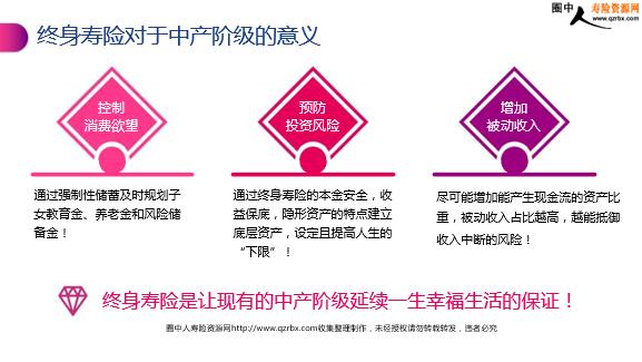 中高端客户 终身寿险销售技巧 4.0时代营销转型 的机遇与挑战 终身寿险意义与功用 与目标客户需求分析 03 目录 CONTNETS 客户购买行为及心理分析 4.0时代营销转型 的机遇与挑战 营销人员的心态 一半是海水 一半是火焰 破解80/20难题:科学的销售流程是成功的关键 1 满足 没问题 2 认知 小问题 3 决定 大问题 4 需求 清单 5 标准 标准 6 评估 比较 7 选择 决策 8 后悔 后悔 客户的购买流程 婚姻债务税务传承 养老子女教育消费支出 疾病身故财产损失 ——所有权风险 ——支出性风险 ——生存保障风险 保障类保险:医疗险、重疾险、意外险、寿险、车险、家财险 转移型保险:年金险、终身寿险 理财类保险:年金险、分红险、万能险、投资连结险 防守体系:分级对冲风险 过着所谓的品质生活,实 际上只是衣冠牛马,疲于奔命 终其一生,持续的现金流收入 是长悬头上的达摩克利斯剑, 最后搞不好还要推迟退休,养 老金还不知道有没有着落或者 缩水。 中产阶级陷阱 中产阶级陷阱就是人们不断努力工作,寻求升职加薪的机会,但是目的都是为了让生活变得更舒适,按理说这样也没错,可是很多人的做法却是在不断购买自以为是资产的负债。 为了追求更舒适的生活,不断购买更大的房子,更好的小汽车,更高的子女教育要求,追逐各种高档奢侈品牌,希望自己的生活看起来更符合中产阶级的身份,过上了一种高资产、高负债的生活状态,在升职加薪之后,又会购买更多自以为是资产的负债,收入增加的同时,负债也在不断增加,总是摆脱不了这个问题,同时也使自己或者家庭抵御风险的能力变得极低。