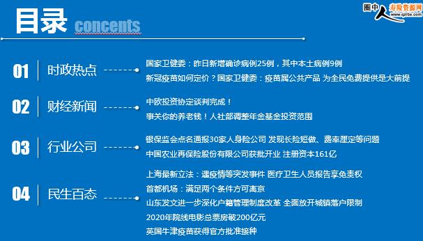 每日新闻速递 2021年1月1日 星期五 目录 时政热点 财经新闻 行业公司 民生百态 时政热点 国家卫健委:昨日新增确诊病例25例,其中本土病例9例 新冠疫苗如何定价?国家卫健委:疫苗属公共产品 为全民免费提供是大前提 中欧投资协定谈判完成! 事关你的养老钱!人社部调整年金基金投资范围 银保监会点名通报30家人身险公司 发现长险短做、费率厘定等问题 中国农业再保险股份有限公司获批开业 注册资本161亿 上海最新立法:遇疫情等突发事件 医疗卫生人员报告享免责权 首都机场:满足两个条件方可离京 山东发文进一步深化户籍管理制度改革 全面放开城镇落户限制 2020年院线电影总票房破200亿元 英国牛津疫苗获得官方批准接种 时政热点 国家卫健委:昨日新增确诊病例25例,其中本土病例9例 2020-12-31 10:00:39 来源:环球网 12月30日0—24时,31个省(自治区、直辖市)和新疆生产建设兵团报告新增确诊病例25例,其中境外输入病例16例(上海6例,内蒙古3例,广东3例,四川2例,福建1例,陕西1例),本土病例9例(辽宁5例,北京2例,黑龙江2例);无新增死亡病例;无新增疑似病例。 新冠疫苗如何定价?国家卫健委:疫苗属公共产品 为全民免费提供是大前提 2020-12-31 10:18:13 来源:环球网 12月31日上午,国务院联防联控机制举行新闻发布会,介绍新冠病毒疫苗附条件上市及相关工作情况。 国家卫健委副主任、国务院联防联控机制科研攻关组疫苗研发专班负责人曾益新指出,疫苗的基本属性是属于公共产品,“价格可能会根据使用规模的大小有所变化。但是一个大前提是,肯定是为全民免费提供,这是一个大前提。”