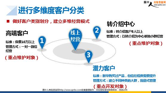 微信客户群经营 目录 CONTENTS 建立多维度微信群 精心运营提升价值 把握购买契机 建立多维度微信群为什么需要客户微信群;多维客户分类;常见建群方式; 利用碎片化的时间管理客户认知 与客户建立并强化信任 为什么需要客户微信群? ——我的客户由我来服务 你有几个微信客户群?你的客户群是“僵尸群”吗?你有在群里一呼百应的效果吗? 想一下: 进行多维度客户分类 线上经营 标准:保费10万以上 管理方式:一对一微信经营 标准:转介绍客户5人以上管理方式:以转介绍为中心单独小群经营 标准:新华购买过产品,但信任程度需要提升管理方式:建立不同种类的大群,批量式管理 高端客户 转介绍中心 潜力客户 (重点维护对象) (重点维护对象) (重点开发对象) 做好客户类别划分,建立多维经营模式 常见微信群建群方式 以影响力为中心建群:做好支持、配合以服务方式划分组群:VIP群、潜力客户群以年龄为筛选条件建群:年轻人、老年人、70后、80后、90后各类功能群: 客户活动群:读书、春游、公益等各类兴趣活动群;客户学习群:专业课程,引起兴趣、增加粘性;临时讲座群:提出要求,严格遵守、提出建议; ..................... 每个群都有自己的特点共同的话题,更有凝聚力