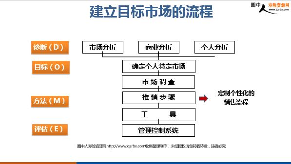 找出你的目标市场 课程大纲 如何建立目标市场 找出你的目标市场 写出你的行动方案 市场分析 商业分析 个人分析 确定个人特定市场 市场调查 推销步骤 工具 管理控制系统 建立目标市场的流程 目标市场的建立有一套按部就班的执行步骤,彼此环环相扣,逻辑严密,是协助业务人员建立并执行目标市场的作业程序。 诊断(D) 目标(O) 方法(M) 评估(E) 定制个性化的销售流程 如何进行目标市场分析 运用《目标市场分析表》,从八个方面进行详细的分析 医务人员 专业人士 私营小业主 目标市场开拓技巧(一) 选定影响力中心适当的时候考虑合作展业认真搜集目标市场的情报展业工具的精心准备 目标市场开拓技巧(二) 设定需求和接触的话题设计该市场的保险套餐设计该市场的推销流程设计具有个性的计划书 目标市场开拓技巧(三)