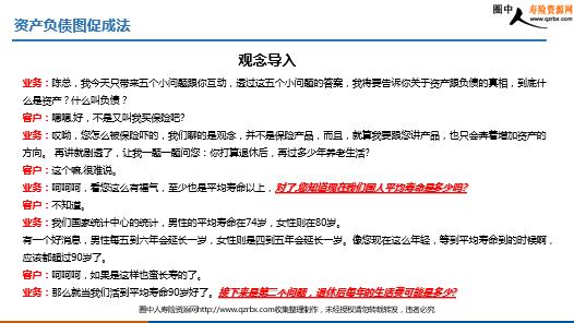 资产负债图促成 重温保险的中心思想 一、想得圆 二、看得远 三、负责任资产负债图促成法 业务:陈总,我今天只带来五个小问题跟你互动,透过这五个小问题的答案,我将要告诉你关于资产跟负债的真相,到底什么是资产?什么叫负债?客户:嗯嗯,好,不是又叫我买保险吧? 业务:哎呦,您怎么被保险吓的,我们聊的是观念,并不是保险产品,而且,就算我要跟您讲产品,也只会奔着增加资产的方向。 再讲就剧透了,让我一题一题问您:你打算退休后,再过多少年养老生活? 客户:这个嘛,很难说。业务:呵呵呵,看您这么有福气,至少也是平均寿命以上,对了,您知道现在我们国人平均寿命是多少吗? 客户:不知道。业务:我们国家统计中心的统计,男性的平均寿命在74岁,女性则在80岁。有一个好消息,男性每五到六年会延长一岁,女性则是四到五年会延长一岁。像您现在这么年轻,等到平均寿命到的时候啊,应该都超过90岁了。客户:呵呵呵,如果是这样也蛮长寿的了。业务:那么就当我们活到平均寿命90岁好了。接下来是第二个问题,退休后每年的生活费可能是多少? 观念导入 资产负债图促成法 客户:那可能一年要10万多。平均下来一个月 1万? 业务:其实你如果预估以后每个月1万块钱的生活费,都算是节俭的了。但如果就算每个月1万块。我祝你长命百岁,你有没有想过我们的生活费会有多少差额?客户:真没想过。业务:其实不只是你没想过。每一个我问过的人,没有一个说他想过的。但当他们听完资产,负债的关系以后,都豁然开朗。现在我就要来跟你解释一下。什么是资产?什么是负债?你知道你现在的资产有哪些吗?客户:房子,车子,存款,还有投资。业务:简单的来说,资产就是会把钱从别人口袋拿回到我们自己口袋的;负债就是会把钱从我们口袋拿出去的。现在再来看看你说的房子,如果房子会一直增值,而且没有房贷的问题,那它肯定是资产。但如果它增不了值,而且又有很多贷款,那就会是负债。 你知道吗?我们付贷款买房子 ,最后并不是付一个房价,而是付出了一倍的房价,才买到的房子。车子就更不用说了。你什么时候看过车子买了以后每年还可以卖越来越多的钱,车子当你买到手就开始打折,每年都折旧,一直到你这台车不值钱为止,所以除非你是开滴滴的,不然车子就是负债了。客户:那怎么办? 业务:我透过两个图表,跟您说明,您就知道怎么买资产来替您赚钱 资产负债图促成法 资产负债图促成法 ...........