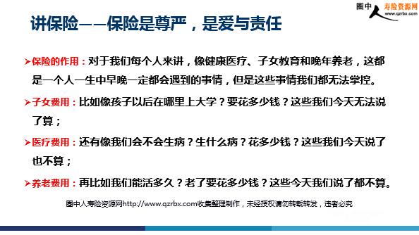 专业初访面谈 完善信息服务至上 需求分析专业制胜 分类经营高效促成 前言:三访销售步骤 不想被灭灯? 第一印象 初访很重要 一、三讲的作用 讲保险→改变客户认知,强化共识讲公司 →提升客户认同度,产生认同讲自己 →建立彼此间的信任,拉进距离 讲保险——保险是一种科学的制度安排 1.自己以前对于保险的看法:在我没有进入保险公司学习之前,我也和很多人一样认为保险有没有都照样过日子,但是经过了系统的培训后我发现有没有那还真是不一样。 2.现在的自己对于保险的看法:现在你要问我保险有什么用,我会说保险是人的金融生命,一份保险使得让责任继续,让爱永恒——年轻时不拖累生你的人,年老时不拖累你生的人,保住赚钱的人,守住赚到的钱。保险就是转移风险、补偿损失的最佳手段。保险对于不同的人来讲作用也是不一样的,对于普通家庭来讲它主要的作用就是提供人身保障,养成强制储蓄的习惯,提前规划好未来;而对于高端客户家庭来讲,它的作用就是保全资产。是一种科学的规避风险的制度。 讲保险——保险是尊严,是爱与责任 保险的作用:对于我们每个人来讲,像健康医疗、子女教育和晚年养老,这都是一个人一生中早晚一定都会遇到的事情,但是这些事情我们都无法掌控。子女费用:比如像孩子以后在哪里上大学?要花多少钱?这些我们今天无法说了算;医疗费用:还有像我们会不会生病?生什么病?花多少钱?这些我们今天说了也不算;养老费用:再比如我们能活多久?老了要花多少钱?这些今天我们说了都不算。 讲保险——保险是尊严,是爱与责任 保险为大家带来尊严、爱与责任:中国有句古话叫“人无远虑,必有近忧”。所以既然我们今天说了都不算,那还是要提前早做规划。您说对不对?其实无论给谁买保险最终都是给我们自己买的,钱还是咱自己的钱。您不会因为没有买保险而富到哪里去,也不会因为买了保险而穷的吃不起饭。相反最终我们都会因为买了保险而帮助自己真正存下了一笔钱!讲保险——讲保险是朝阳的行业 购买保险的人越来越多:不知道您发现没有,现在购买保险的人是越来越多而不是越来越少。国家政策支持:另外咱们国家真的是大力推动商业保险的发展,国家专门颁布“国十条” ,自2013年起每年的7月8号,定为"全国保险公众宣传日",这都是国家政策大力支持的表现啊。保险是必需品