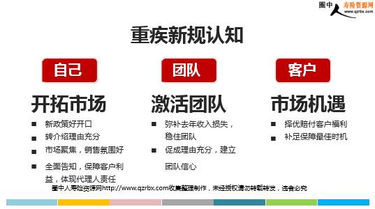 重疾新规下单兵销售逻辑 目 录 CONTENTS 重疾新规认知 单兵销售逻辑 重疾新规认知 自己 开拓市场 新政策好开口转介绍理由充分市场聚焦,销售氛围好 全面告知,保障客户利益,体现代理人责任 团队 激活团队 弥补去年收入损失,稳住团队促成理由充分,建立 团队信心 客户 市场机遇 择优赔付客户福利补足保障最佳时机 名单做实,先易后难, 重点盘点3类客户群体 ① 保额不足女性健康险客户 ② 保险功能配置不合理客户 ③ 其他潜在客户(意外险、超e保) 名单整理目 录 CONTENTS 重疾新规认知 单兵销售逻辑 重疾新规销售流程 一邀约见面 三话题导入 四理念沟通 二寒暄赞美 五产品介绍 六强势促成 七异议处理转介绍 xx客户还年轻 要商量转介绍 大影响,您要知情,我要告知,具体需要当面和您讲一下。 邀约见面-电话邀约 为见面创造一切可能 告知函需当面讲解并签字确认 王姐,我给您发的微信,不知道您看没看到,最近中国保险行业协会与中国医师协会联合发布重疾定义调整,保险公司于2月1日起不再销售当前定义的重疾保险,xx作为一家央企特针对本次调整,推出了“择优理赔方案”,这完全是拿出真金白银给客户的一个让利服务。这个方案有一个告知函需要当面跟您讲解并签字确认。您看今天下午还是晚上有时间?见面和您细致说一下,您看下午2点还是3点方便!(如客户不方便,直接约其他时间) 衣着赞美 食物赞美 办公环境 领导风格 家庭子女