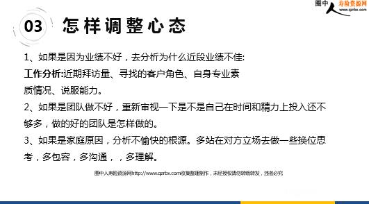 人寿保险经营技巧 保险营销员的困扰 拜访受措签单不成业,绩波动增员不顺队伍委缩 家庭不理解其他 难? 不难? 好的心态是保险营销成功的保证! 1、从宏观上说,是一个人对生活和事物的看法和态度,在一定程度上决定于一个人的性格。 2、从微观上说,是在某一-特定环境中,对某~ -事件的看法和态度以及所表现出来的情绪。 3、心态,在一定程度上决定着一个人处理某一事件的执行力和效力,乃至影响着其在某个人生阶段在事业.上的成功与失败。 心态不好的原因 1、一段时间以来没有业绩,最近经常遭到客户的拒绝,佣金收入低。 2、近段时间团队经营指标不佳,士气比较低迷,感觉力不从心。 3、生活中发生不愉快的事情:比如:身体不舒服;夫妻4、闹别扭;小孩不听话;投资失败;等外围环境不佳:天气不好;周 围环境太吵;周围都是- -些贪图享受,不思进取的人;周围的人整天悲观叹气,影响了你;等。心态不好的表现 1、不想出勤。 2、拜访量低。 3、情绪波动,甚至产生离司念头。 4、沉迷于打麻将等低级趣味的娱乐活动。 5、其他。 怎样调整心态 1、如果是因为业绩不好,去分析为什么近段业绩不佳: 工作分析:近期拜访量、寻找的客户角色、自身专业素质情况、说服能力。 2、如果是团队做不好,重新审视一下是不是自己在时间和精力上投入还不够多,做的好的团队是怎样做的。 3、如果是家庭原因,分析不愉快的根源。多站在对方立场去做一些换位思考,多包容,多沟通,,多理解。 正视行业性质: 1、有人认同保险,所以我们存在;人不认同保险,所以我们存在。 2、客户的第一次、第二次甚至第三次拒绝,都是很正常的,因为客户认识和了解保险需要一个过程。 3、不能正视客户的拒绝, 往往是对自己及对客户的要求太高了。 4、销售的流程本身伴随着客户从拒绝到接受这样一个过程。 5、有量的积累才有质的飞跃,多拜访你就会习惯拒绝、就会处理拒绝。 借助外在人的力量: 1、多去接触一-些.上进心强、心态积极的人,并多与之沟通和交流。 2、有意识的避开庸庸碌碌、不求上进、怨天尤人的人。