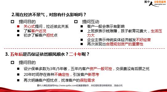 年金险成功签单“三步曲” 年金险成功签单三步曲 1.怎么样从白手起家创造出现在的生活? 提问目的 请教式提问,让客户有一种被“崇拜感” 更进一步了解客户,汲取客户优点 引导客户感受如今生活都是靠自己的打拼和努力创造的,财富来之不易 提问互动 大部分客户会讲述自己的历程 结合自身的创业经历和客户交流挣钱的不易 更应该珍惜现在拥有的一切,合理规划资产 2.现在经济不景气,对您有什么影响吗? 提问目的 关心式提问,拉近彼此关系 了解客户近况 初步了解客户担忧点 提问互动 客户一般会表示有影响 上班族表示钱难赚,孩子教育花费大,生活压力大 企业主表示传统实体经济越发不好经营 再次体现出合理规划资产的重要性3.五年后是否保证依然顺风顺水?二十年呢? 提问目的 设计保单多数为3年/5年缴,五年内客户资产一般可控,交保费没有后顾之忧 20年时间存在各种不确定性,引发客户新思考 再次明确客户担忧点,找准客户的保险需求 提问互动 五年内大部分客户表示风险可控,但二十年不确定 有的企业主担忧公司经营存在风险 有的上班族担忧钱不够养老,无足够的钱留给孩子 根据客户的保险需求,引出适用故事,进一步激发客户共鸣,引起客户的危机意识 3.五年后是否保证依然顺风顺水?二十年呢? 年金险成功签单三步曲