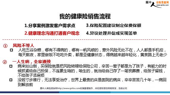 健康险销售流程 风险不等人人吃五谷杂粮,哪有不得病的,哪有一帆风顺的,意外风险无处不在,人人都是手机控,每天熬夜,家里做饭不吃吃外卖,都是亚健康状态,得病越来越年轻化,黄泉路上无老少 一人生病,全家遭殃病来如山倒,买保险就是把风险转嫁给保险公司,辛苦一辈子都是为了孩子,有能力的时候抓紧给自己投保,不连累生咱的,咱生的,就当给自己存了一笔丧葬费,给孩子留钱,不给孩子添麻烦没钱寸步难行,无法享受治疗,世界上最贵的床是医院的病床,辛辛苦苦几十年,一病回到解放前 根据收入确定保费、保额保费:年收入的10%-20%购买保险保障分配:若收入有限,没有保障的家庭成员至少添加底线保障5万 根据年龄确定保额中年人:20万保障是标配年长者:不超过体检额度的最高保额孩子:不超过体检额度的最高保额没钱买保险现在3千五千都拿不出来,以后真生病了,30万50万更拿不出来,钱挤挤就出来,不花到这也花到别的地方了你看看我自己的保单和我女儿的保单,同样是人,差距不能那么大,公司产品升级了我第一时间就购买,保障特别全面 等等再说趁孩子健康赶紧买保险,没有住院史能直接承保,干啥都是为了孩子,到时候有病例就得责任免除或者加费,现在不是你买不买的问题,你还得看公司卖不卖给你重疾理赔之后,多活五年后身故给保额,重症监护等都能报销,还提前支付5万,解决燃眉之急,现在借钱多难,别说5万了,500都难(产品亮点促成) 现在国家都大力支持,保单都受法律保护的,受银保监会监管,人不能自私,要有责任有担当我一定是终身为您做好售后服务的,我不一定是最优秀的,但一定会最努力的,在我这买保险放心,我为你终身负责不要再等了,在等了保不上就得后悔,人生每天都是现场直播,没有彩排