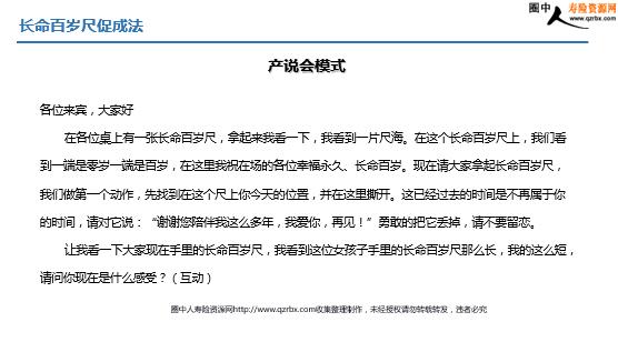 长命百岁尺 长命百岁尺促成法 各位来宾,大家好 在各位桌上有一张长命百岁尺,拿起来我看一下,我看到一片尺海。在这个长命百岁尺上,我们看到一端是零岁一端是百岁,在这里我祝在场的各位幸福永久、长命百岁。现在请大家拿起长命百岁尺,我们做第一个动作,先找到在这个尺上你今天的位置,并在这里撕开。这已经过去的时间是不再属于你的时间,请对它说:“谢谢您陪伴我这么多年,我爱你,再见!”勇敢的把它丢掉,请不要留恋。 让我看一下大家现在手里的长命百岁尺,我看到这位女孩子手里的长命百岁尺那么长,我的这么短,请问你现在是什么感受?(互动) 产说会模式 长命百岁尺促成法 100岁 刚刚我祝福大家幸福永久,长命百岁。可是我们真的能活到100岁吗?有些人觉得自己可以,有些人觉得不能。如果您觉得您可以长命百岁,请不要动。如果您和我一样,觉得在百岁之前就会与上帝一起喝茶,请找到这个时间的大概位置,撕开。把不属于你的这段时间勇敢的丢掉。请各位再举起来。我看到大家的长命百岁尺还很长,大家都希望自己长命百岁,不愿意撕掉对不对? 长命百岁尺促成法 我们都有退休的时间,让我们找到退休的时间,并把这里左右撕开,请把这两段举起来。我们先举起来现在到退休的这一段,我问大家问题,请大家回答我,有可能大家的答案是一致的: 业:现在的你,有没有在上班?客:有;业:有没有赚钱?客:有; 业:花不花钱?客:花;业:花谁的钱?客:自己的钱。 把它慢慢放下来,别丢,这段还活着。请把另一段举起来,这张是退休的你,我再问,大家一起回答: 业:这一段的你,有没有在上班?客:没有;业:有没有赚钱?客:没有; 业:花不花钱?客:花;业:花谁的钱?客:自己的! 才不是!花的是(举起现在至退休那一段)这个你的钱!想不想在退休之后给自己每年都来一次说走就走的旅行?旅费谁准备?(互动)现在你就要开始准备了,所以今天我给大家带来了很好的退休规划,给未来的自己准备一个说走就走的旅行的旅费,现在准备,将来享乐。现在的你,养两个你。请记得长寿有钱就是享受,长寿没钱就是难受。 演练与通关