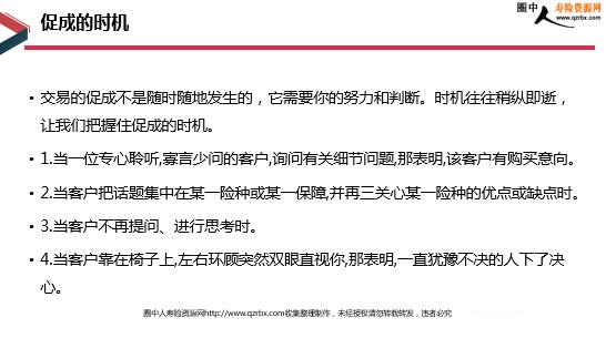 促成训练 销售是一个循环的过程,而促成是循环中的一个环节。具体到保险营销方面,这个循环可以分为以下几个环节: 1.寻找准客户;约访; 2.销售面谈(目的是给客户做需求分析); 3.成交面谈,也就是促成; 4.售后服务,寻求转介绍。这几个环节是一个不断循环的过程。 保险销售的循环 一.自身的准备 1.熟练的掌握产品内容. 2.职业的外表形象和恰当的言谈举止二.对客户的了解 1.了解客户的需求所在及客户的经济承受能力 2.了解所要促约的群体中谁是具有决定权的人 促成的准备 交易的促成不是随时随地发生的,它需要你的努力和判断。时机往往稍纵即逝,让我们把握住促成的时机。 1.当一位专心聆听,寡言少问的客户,询问有关细节问题,那表明,该客户有购买意向。 2.当客户把话题集中在某一险种或某一保障,并再三关心某一险种的优点或缺点时。 3.当客户不再提问、进行思考时。 4.当客户靠在椅子上,左右环顾突然双眼直视你,那表明,一直犹豫不决的人下了决心。促成的时机 5、当客户不断点头对代理人的话表示同意时。 6、当客户对保险保障的细节表现出强烈的兴趣,并开始关心售后服务时。 7、当客户最大的疑虑得到彻底解决,并为你的专业程度所折服时。 8、当客户听到产品介绍,瞳孔放大,眼睛发亮时。促成的时机 1、激将法好胜是人的本性,掌握人性的弱点,激发准客户的购买意愿,从而促使客户确定签单的决心。例如:您看那么多客户都已经投保了传家,您是否需要一份呢? 2、赞美鼓励法以肯定的赞语坚定客户购买的决心,是促成签单的一种方法。赞语对客户而言是一种动力,可以使犹豫者变得果断,拒绝者无法拒绝。采用此法的前提是必须确认客户对产品已产生浓厚兴趣,而且赞美客户一定要发自内心、语言实在、态度诚恳。例如:2个账户实现财富和身价的增值和传承,像您这样的高端人群非常有智慧,肯定会选择传家这款产品的,你看你是申请5万还是10万呢?促成的方法 3、二择一法 提供给客户几种选择方案,任其自选一种。这种方法用来帮助那些没有决定力的客户进行交易。客户只要回答询问,不管他的选择如何,总能达成交易。换句话说,不论他如何选择,购买已成定局。例如:所有客户都要通过公司严格审核,申请很容易,获得资格很难,我们先提交资料公司进行审核,您是申请10万还是5万呢? 4、“是”的逼近法在展业过程中,如果你能让客户持续说“是”,那么你的签单几率会大大提高。就是说,用一连串客户只能回答“是”的问题,促成客户下决心购买。促成的方法 ...........