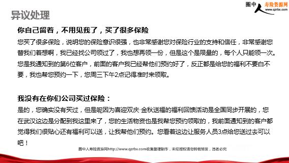 客户面见流程 目 录 拜访总结 面见拜访 寻求话题 电话约访 电话约访 电话约访 您好!您这边是XXX先生/女士吗?今天给您致电是有一件很重要的事情通知到您,为确保是您本人和您核对一下您的身份信息,您身份证显示出生日期是XXXX年X月X日对吗?好的!核对完毕,感谢您的配合,我们也是响应国家的号召,在中秋国庆双庆到来之前,为所有购买过商业保险的客户,赠送一份生活物资大礼包。请问您的地址是哪里,我们会安排礼品派送专员给您送过去!您是下午两点还是三点方便签收呢?好的!这边已经给您备注好了,我们派送过去之前会有人提前和您联系的!那祝您身体健康,家庭美满,再见!为了表示对您的尊重,请您先挂断电话! 异议处理 你自己留着,不用见我了,买了很多保险您买了很多保险,说明您的保险意识很强,也非常感谢您对保险行业的支持和信任,非常感谢您替我们着想啊,我已经找公司领过了,我也想再领一份,但是这个是限量的,每个人只能领一次。您是我通知到的第6位客户,前面的客户我已经帮他们预约好了,反正都是给您的福利不要白不要,我也帮您预约一下,您周三下午2点记得准时来领取。 我没有在你们公司买过保险:是的,您确实没有买过,但是呢因为喜迎双庆·金秋送福的福利回馈活动是全国同步开展的,您在武汉这边是分配到我这里来了,您的生活物资也是我帮您预约领取的,我前面通知到的客户都觉得我们很贴心还有福利可以送,让我帮他们预约。您看着这边让服务人员3点给您送过去可以吧! 异议处理 不需要:没关系的,反正这个生活物资我们平常都会需要,而且这个也是给您的福利为了感谢您支持我们国家的政策,不要白不要,您看我给您安排三点钟给您送过去可以吗。 您把东西放保安亭吧?(礼品给我邻居吧?) 不好意思!公司要求我们工作人员必须将礼品亲自交到客户手里,确定一对一的售后服务关系,并且将保险行业最近的发展状况以及最新政策进行告知;同时,您以后遇到的所有关于保险的问题都可以联系我。您是今天下午还是明天上午方便呢? 异议处理