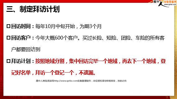客户大回访四步流程 成交不是服务的终点,而是服务的开始客户因重视而忠诚,因重视而追随不是要业绩时候才去找客户,客户来源于持续的服务 我对客户大回访认知 经营老客户 微信朋友圈预热回访前准备制定拜访计划回访递送促加保客户大回访四步流程 经营老客户 一、微信朋友圈预热(1/2) 朋友圈转发话术话术1:做我的客户让我来宠你,新年礼物我已开始预订,请大家耐心等待!!(让客户选礼物,与客户互动) 话术2:做我的客户让我来宠你吧。新年礼物已经到货,因客户数量太多,送达的时间可能不一样,请大家耐心等待,我会一一送到今天下午在东城,东城的客户可以约了! 经营老客户 晒:朋友圈晒回访礼物。让客户选择,增加互动,与客户交流。预告:告知客户自己回访的位置,让客户知道自己在行动,也让周围客户等待拜访。 一、微信朋友圈预热(2/2) 经营老客户 二、回访前准备 不同类型客户选择不同回访礼物有孩子的妈爸、妈宝 —— 有孩子、比较小资 —— 时尚毛绒玩具(当年属相)年龄45-55岁 —— 务实、家庭顶梁柱 —— 干果礼盒/饺子盘村里的亲朋好友 —— 接地气、年味重 —— 适合农村门贴的大对联 因地制宜选择客户喜欢的回访礼品是关键,千万不要一种礼品送给所有的客户例:饺子盘,选择原因是45-55岁客户都很重视过年,过年都会回家。春节过年一定吃饺子,人多吃饺子需要用大饺子盘。送饺子盘就送到了客户心里。 经营老客户 回访时间:每年10月中旬开始,为期3个月回访客户:今年大概600个客户。买过长险、短险、团险、车险的所有客户都要回访到拜访计划:按照地域分割,集中回访完毕一个地域,再去下一个地域,登记好名单,拜访一个登记一个,不遗漏。