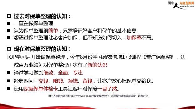 借助保单整理促成老客户加保 老客户群体特征 对保险认同度高、有健康险需求。家庭年收入10-20万,收入稳定。性格和爱好有一定程度的了解。保额突破的原因——TOP学习改变健康险认知 目 录 一、TOP学习带来的观念的改变二、借助保单整理促加保的流程 过去对保单整理的认知:一直在做保单整理认为保单整理很简单,只需登记好客户和保单的基本信息想通过保单整理让老客户加保,但不知道如何切入,加保率不高。 现在对保单整理的认知: TOP学习后开始做保单整理,今年8月份学习绩效倍增1+3课程《专注保单整理,达成百万业绩》对保单整理再次有了新的认识通过学习做到细致、全面、专注经典四问:交钱、赔钱、领钱、留钱,让客户放心把保单交给我。使用家庭保单体检卡工具让客户对保障一目了然。 2019年底开始改进保单整理流程:过去日记本零星记录没有固定流程保单检视面谈逻辑不清晰,找不到突破口 现在把所有客户信息整理出来,做好规划拜访,形成良好的工作习惯。使用《家庭保单体检卡》整理保单,缺口一目了然面谈有逻辑,客户更放心,有说服力。 2019年12月通过保单整理成交1个家庭,年缴3.6万/6件家庭保单整理后,发现保障缺口,加保两件,为家庭补充4件保单半年后成功转介绍,签单两件目 录 一、TOP学习带来的观念的改变二、借助保单整理促加保的流程 1、月初整理客户名单,优选重点客户30+ 重点客户的标准: 20万健康险保额以下的低保额老客户 2、邀约面谈拿到保单,分析保障缺口电话邀约面谈邀约成功——现场整理邀约不成功——拿回家整理家庭年收入10-20万左右,收入稳定 填写家庭保单体检卡,分析保障缺口。 3、针对保障缺口、优先补充健康、意外险缺口通过家庭保单体检卡,分析家庭中每个人员的保障缺口,优先补充健康险、医疗险、意外险缺口。 4、加保遇到的问题及处理加保遇到的问题-经济紧张,再等等一时经济紧张,可以再等等,但可以给家庭目前无保障人员购买一份健康险保障