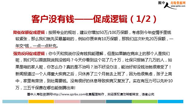 单兵拜访告知会服务流程 目录 1.单兵拜访流程 2.告知会服务流程 见面前准备 工具准备:理赔案例,家庭保单整理,以保险责任的明细为核心展示给客户看,了解每个人拥有多少保障? 心理准备:根据客户情况规划这次要给谁加保,加什么产品?客户大约保费承受能力是多少?做到心中有数,如果家里医疗险有缺口的,顺便讲医疗险! 借助保单整理沟通 明晰家庭保障情况:在保单的明细上,每一项上都会有:给谁买的?谁是投保人?保额是多少?保障期限是多少?交费多少年?应交保费多少?已交保费多少? 同理心沟通:打开xx服务号展示自己的30几张保单,讲我为什么买这么多保单?收入可能没有你高,家里每位成员的保障却都是足额的。人活一世,健康是最重要的。如果我们的健康出了问题,钱就至关重要,不动产变现很困难,即使变现了花起来也心疼,保险公司为我们的健康保驾护航,更能心安理得。 重疾新规调整沟通 沟通逻辑:2007年国家颁布了第一版重疾定义条例,规划理赔标准,随着时代的发展和医疗水平的进步,老版 已经不适合现在的形势,2021年2月1日开始执行新版的重疾定义规定。你也看到了,新规旧规各有优势,我们如何抉择?xx人寿践行央企社会责任,拥有2021年2月1日前重疾险保单的老客户,被保险人2020年11月5日后初次被诊断为条款内的病种,可以选择择优理赔,新版旧版哪个对我们有益选择哪个,决定权在我们自己! 除非这两年不加保,如果要加保一定请现在,因为有择优理赔! 客户仅有百万医疗促成逻辑 重疾险弥补自己和家人收入损失。医疗险跟重疾险解决的是不同的问题,人生病了不可能一直在医院住,医疗险只是解决住院费用,钱都给到了医院,跟我们没有关系。跟我们未来和家人有关系的,是我们买了多少保额的重大疾病保险,它是给到我们自己和家人未来吃饭的钱,是给到我们尊严和收入损失的钱。