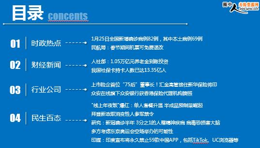 每日新闻速递 2021年1月27日 星期三 目录 时政热点 财经新闻 行业公司 民生百态 时政热点 1月25日全国新增确诊病例82例,其中本土病例69例 民航局:春节期间机票可免费退改 人社部:1.05万亿元养老金到账投资 我国社保卡持卡人数已达13.35亿人 上市险企首位“75后”董事长!汇金高管接任新华保险帅印 众安在线旗下众安银行获香港保险代理机构牌照 "线上年夜饭"爆红:单人套餐升温 半成品预制菜崛起 拜登新政取消变性人参军禁令 研究:新冠确诊半年 3分之1的人罹精神疾病 病毒恐损害大脑 多方考虑东京奥运会空场举办的可能性 印媒:印度宣布将永久禁止59款中国APP,包括TikTok、UC浏览器等 时政热点 1月25日全国新增确诊病例82例,其中本土病例69例 2021-01-26 08:52:01 来源:知知贵阳 1月25日0—24时,31个省(自治区、直辖市)和新疆生产建设兵团报告新增确诊病例82例,其中境外输入病例13例(上海8例,广东2例,福建1例,湖南1例,陕西1例),本土病例69例(黑龙江53例,吉林7例,河北5例,北京2例,上海2例);新增死亡病例1例,为本土病例,在吉林;新增疑似病例3例,均为境外输入病例(均在上海)。 民航局:春节期间机票可免费退改 2021-01-26 10:25:46 来源:中国民航局 1月26日,民航局下发通知,明确自1月27日0时起,购买1月28日—3月8日春节期间机票的旅客,均可办理免费退票或至少一次改期。 具体退改规则为:乘机日期在1月28日至2月3日的旅客,自1月27日0时起至航班起飞前可提出退票或改期申请;乘机日期在2月4日至3月8日的旅客,自1月27日0时起至航班起飞前7天可提出退票或改期申请。1月27日0时前已申请退票或改期的旅客,不适用于本政策。