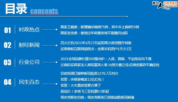 每日新闻速递 2021年1月28日 星期四 目录 时政热点 财经新闻 行业公司 民生百态 时政热点 国家卫健委:新增确诊病例75例,其中本土病例55例 国家发改委:就地过年政策各地不能擅自加码 四大行自2021年1月27日起即再次房贷提升利率 运营商和互联网迎拐点:全国手机用户1天少2万 2021全球品牌价值500强出炉:人保、国寿、平安排名均下滑 云南拟设首家法人寿险富滇人寿 出资方健之佳:后续进展存不确定性 目前我国已接种新冠疫苗2276.7万剂次 官宣:央视春晚发12亿红包! 官宣!火车票改签更方便了 超低价!多地飞三亚机票0.5折起 塔吉克斯坦总统:塔吉克斯坦已彻底战胜新冠病毒 时政热点 国家卫健委:新增确诊病例75例,其中本土病例55例 2021-01-27 08:52:01 来源:环球网 1月26日0—24时,31个省(自治区、直辖市)和新疆生产建设兵团报告新增确诊病例75例,其中境外输入病例20例(广东7例,上海5例,甘肃4例,天津2例,江苏1例,四川1例),本土病例55例(黑龙江29例,吉林14例,河北7例,北京4例,上海1例);无新增死亡病例;新增疑似病例1例,为本土病例(在陕西)。 国家发改委:就地过年政策各地不能擅自加码 2021-01-27 10:25:46 来源:中国青年网 今天,国务院联防联控机制举行新闻发布会,介绍《关于做好人民群众就地过年服务保障工作的通知》有关情况,并答记者问。 国家发改委秘书长赵辰昕介绍,就地过年政策是分级分类的。各地方在政策执行时,不能擅自加码,更不能层层加码,坚决不允许“一刀切”,不能阻断人员出行返乡,要给人民群众多些保障,多些便利。