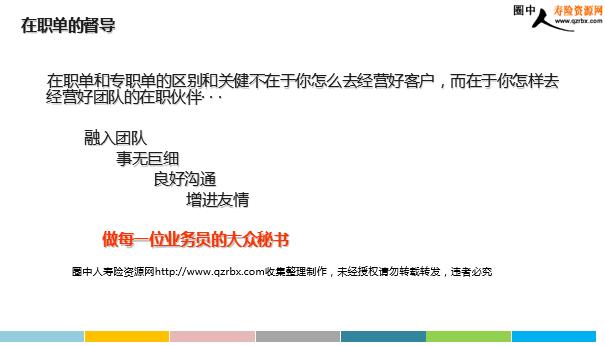 续期专员自我管理技能篇 确定目标 目标是方向更是一种责任 当月综合指标确保80%,力争超越90% 宽末综合指标确保90%,力争超越95% 向钻星俱乐部五星级会员冲击 我有责任做好续期,给公司交上满意的答卷我有责任不断进取,提高绩效回馈自己的家人 良好心态 心态主导状态 状态决定成效 成效体现价值 价值成就梦想 工作习惯 自觉:工作主动一点,自律:行为规范一点,用心:服务细化一点,尽责:办法多找一点,提高:达成提升一点,进度安排 每月二十号~二十五号当月清单下发业务员并进行第一次初步摸底二十号~次月五号当月应收未缴单的逐单追综跟进,并基本完成次月专职二、三期的客户面访五号~十号全面梳理宽末未交单,并做相应记录十号~二十号重点追踪当月各期序时进度和达成每日完成日常续期保费追踪落实和其它服务工作并做好工作日志,期天做好每周小结,每月六号做好月度总结总结执行 每周一小结,每月一总结,举案说例成功失败及时总结,找原因、细分析经常聆听他人的经验和教训有效执行各级指令和工作安排有效执行各项基础工作的完成 不断总结才能进步有效执行就能提高 专职单的经营 对专职单的客户经营其实就是在任何时候都能为客户提供及时、有效和优质的服务和帮助,让每一位客户都能时刻体会到华泰人寿的关爱和责任 做每一位华泰客户的保险保姆 在职单的督导 在职单和专职单的区别和关健不在于你怎么去经营好客户,而在于你怎样去经营好团队的在职伙伴··· 融入团队事无巨细良好沟通增进友情 做每一位业务员的大众秘书心存三句话常念九字经 要预算 早动作 勤思学 心存三句话常念九字经 要:我要… 是一种追求;是积极向上的心态是自觉自律自信自强的音符是实现自我目标和愿景的强大动力 是我要而决不是要我心存三句话常念九字经 预:预测… 提前的评估,及时的预案,快速的发应,预警… 加强自我有效监控,强化自我管理能力,预备… 面对各种困难和挑战的充分准备 凡事预则立不预则废心存三句话常念九字经 算:序时进度、目标距离、薪资、达成、缺漏… 计划中的运筹掌控中的提升 心存三句话常念九字经