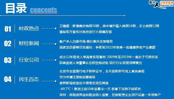 每日新闻速递 2021年2月3日 星期三 目录 时政热点 财经新闻 行业公司 民生百态 时政热点 卫健委:新增确诊病例30例,其中境外输入病例18例,本土病例12例 缅甸军方宣布对政府进行大规模改组 散户杀入白银市场 银价飙升走势强劲 国家发改委等印发通知:争取到2022年培育一批健康养老产业集群 成立12年君龙人寿首度实现盈利 2009年至2019年一直处于亏损状态 招商信诺人寿董事长任职资格获批 招行行长助理刘辉兼任 北京市全面推行电子职称证书,本月起职称可线上查询查验 华为申请注册姚安娜商标 接种新冠疫苗后不得带走按压棉签 -49.7℃!黑龙江迎50年来最冷一天 极寒下冻柿子碎砖块 深圳:将租房押金和租金纳入监管,住房租赁企业须开设唯一专用帐户 时政热点 卫健委:新增确诊病例30例,其中境外输入病例18例,本土病例12例 2021-02-2 08:52:01 来源:环球网 2月1日0—24时,31个省(自治区、直辖市)和新疆生产建设兵团报告新增确诊病例30例,其中境外输入病例18例(上海7例,江苏3例,辽宁2例,广东2例,北京1例,山西1例,四川1例,陕西1例),本土病例12例(黑龙江8例,吉林4例);无新增死亡病例;无新增疑似病例。 缅甸军方宣布对政府进行大规模改组 2021-02-02 08:10:14 来源:新华社 缅甸军方1日晚通过电视发表声明,宣布对缅甸现政府进行大规模改组。 声明说,外交部,国防部,边境事务部,计划、财政和工业部,投资和对外经济关系部,国际合作部等11个中央政府部门的部长被替换。国务资政府部,计划、财政和工业部,商务部等19个中央政府部门的24名副部长被解除职务。