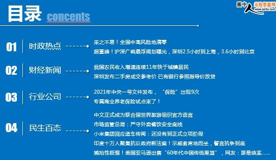 每日新闻速递 2021年2月23日 星期一 目录 时政热点 财经新闻 行业公司 民生百态 时政热点 来之不易!全国中高风险地清零 超重磅!沪深广磁悬浮规划曝光,深圳2.5小时到上海,3.6小时到北京 我国农民收入增速连续11年快于城镇居民 深圳发布二手房成交参考价 已有银行参照指导价放贷 2021年中央一号文件发布, “保险”出现9次 专属商业养老保险试点来了! 中文正式成为联合国世界旅游组织官方语言 市场监管总局:严守外卖餐饮安全底线 小米集团回应造车传闻:还没有到正式立项阶段 印度十万人聚集抗议政府新法案!示威者席地而坐,誓言抗争到底 尴尬性极强!美国亚马逊出售“60年代中国传统果篮”,网友:那是痰盂…… 时政热点 来之不易!全国中高风险地清零 2021-02-22 08:52:01 来源:中宏网 据望奎融媒之声,鉴于黑龙江绥化市望奎县已经连续14日以上无新增新冠肺炎确诊病例和无症状感染者,自2021年2月22日起,将望奎县疫情风险等级由中风险地区调整为低风险地区。至此,全国疫情中高风险地区清零。中国加油! 望奎县调整为低风险! 超重磅!沪深广磁悬浮规划曝光,深圳2.5小时到上海,3.6小时到北京 2021-02-21 08:33:36 来源:证券时报 近日,广东省自然资源厅发布《广东省国土空间规划(2020—2035年)》,规划提出,围绕构建“一核一带一区”区域发展格局,建设上海-汕头-汕尾-深圳-广州(沪深广高速磁悬浮)、北京-韶关-广州-佛山-珠海-澳门(京港澳高速磁悬浮)的磁悬浮线路,还有阳江-珠海-深圳高铁(赣深客专西延线)、琼州海峡通道。 值得一提的是,这是广东首次提出预留建设沪(深)广高速磁悬浮通道。深圳到上海约1500公里,如时速以每小时600公里算,大约2.5小时就可以互通深沪两市。深圳至北京约2200公里,如果乘坐京港澳高速磁悬浮,大约3.6小时可到达北京,比高铁要节省超一半时间。