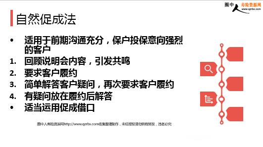 让签单成为自然 对于业务员来说 签单——最心动的时刻 钓鱼的时候什么时候最紧张?什么时候最丧气?鱼已经上钩了为什么拉不上来?你是怎么判断动作的时机?你钓鱼的时候考虑过鱼的感受吗? 您钓过鱼吗? 为什么签单不能顺利进行 主要是谁的问题?客户没有保险观念客户资金不到位客户说话不算数客户受别人的影响如果钓不到鱼是鱼的问题还是你的问题 心态不对:底气不足,畏首畏尾 ——求人还是帮人方法不对:没有方案和应变措施,话术贫乏 ——自乱阵脚不会求援:死要面子活受罪 ——为了莫名其妙的原因自欺欺人 客户“反悔”的原因 只是一种所有人都有的恐惧心理有其他杂音干扰有不方便解释的原因只是一种试探或考验 信心压倒一切必胜的信念:相信公司,相信产品,相信自己良好的状态:活力、激情、感染力,通过剧烈运动调整自己的状态充足的准备:材料、信息、话术、方案 强势促成流程通过投保单直接要求成交处理客户异议通过受益人要求成交处理客户异议通过签字要求成交处理客户异议通过缴费方式要求成交,还可以通过奖品、节日、生效日 强势促成的补救措施 留下陪访的理由:产品绝对没问题,可能我说得不清楚,我请我的经理来给您再讲解一次虽然您还没有决定,但是公司的经理很重视,委托我和您约个时间,经理一定要亲自面见您一次 强势促成的补救措施 留下陪访的理由: 3、公司规定要对所有的高端客户进行回访,检查我们的服务情况,您看什么时间合适 自然促成法 适用于前期沟通充分,保户投保意向强烈的客户回顾说明会内容,引发共鸣要求客户履约简单解答客户疑问,再次要求客户履约有疑问放在履约后解答适当运用促成借口 第三者插足怎么做 家人不同意怎么办:确认是问题还是借口缓和反问法:我非常理解您的感受,能否问一下,他(她)为什么不同意那您觉得他这种想法正确吗?重新确立客户购买的信心如果是借口则直接进