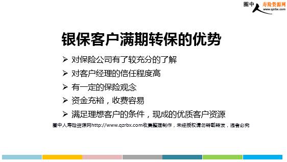 满期转保意义优势服务动作及经营注意事项 目录 一、满期转保的意义 二、满期客户转保优势 三、满期转保的服务动作 四、满期客户经营注意事项 满期转保的意义 做好满期给付和转保工作关系到客户存续和业务发展;关系到公司形象;关系到行业发展;关系到队伍建设。 功在当季,利在永久。 保障可以延续客户深入了解保险的契机享受保险公司更高品质的服务除客户未来对保障和资金的担忧对客户的意义对公司的意义重树公司良好形象降低销售成本,提高业务内涵价值培养忠诚客户群,扩大市场影响力稳定业务团队提高公司竞争力 对客户经理的意义提高客户的忠诚度拓宽客户市场增加个人收入延长自身的职业寿命满期客户转保优势 银保满期客户的特点 现金流充裕,经济条件较好理财观念较先进保险公司的忠实客户职业以工薪阶层与企业经营为准 银保客户满期转保的优势 对保险公司有了较充分的了解对客户经理的信任程度高有一定的保险观念资金充裕,收费容易满足理想客户的条件,现成的优质客户资源 70%-80%的第一次购买寿险消费者,都会向第一个向他推荐寿险产品的销售人员购买 70%-80%的寿险消费者,每隔三年都会购买第二张人寿保单 满期转保的服务动作 售前的服务动作1、服务要做在前 2、服务的方法 A、祝福、关心; B、注重“纯服务”; C、注重了解客户; 1、电话预约客户; 2、做好和客户见面准备; 3、讲解并满期给付政策,推荐产品计划书; 4、换位思考,耐心倾听; 5、坚持良好的服务,引发契机; 6、不放弃任何一位失联客户; 售中的服务动作售后的服务动作一、转保的客户: A、抓住送保单时的机会; B、转保的客户做好分类,分层经营;高端——公司客养中端——部门活动低端——日常维护