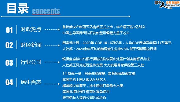 每日新闻速递 2021年3月1日 星期一 目录 时政热点 财经新闻 行业公司 民生百态 时政热点 首批武汉产新冠灭活疫苗正式上市,年产量可达1亿剂次 中国主导国际团队研发新型可编程光量子芯片 国家统计局:2020年 GDP 101.6万亿元,人均GDP连续两年超过1万美元 人社部:2020全年平均城镇调查失业率5.6% 低于预期调控目标 银保监会拟出台银行保险机构恢复和处置计划实施暂行办法 人社部正研究延迟退休方案 大力发展养老保险第三支柱 3月新规一览:刑责年龄调整、教育惩戒新规实施 我国手机上网人数达9.86亿人 榴莲超过车厘子,成中国进口量最大水果 美国批准对强生疫苗的紧急使用 麦当劳与人造肉公司达成合作 时政热点 首批武汉产新冠灭活疫苗正式上市,年产量可达1亿剂次 2021-02-28 10:26:17 来源:北京日报 由国药集团中国生物武汉生物制品研究所有限责任公司研发的新型冠状病毒灭活疫苗正式上市。这也是国内第三个获批附条件上市的新冠疫苗。 2月28日,首批疫苗已经下线发出。武汉生物制品研究所已建成新冠灭活疫苗生物安全车间,经国家有关部门检查和认证后,已投入规模化生产,年产量可达1亿剂次。 中国主导国际团队研发新型可编程光量子芯片 2021-02-28 08:33:36 来源:新华社 中国科研人员主导的国际团队26日在美国《科学进展》期刊上发表论文说,他们研发出一款新型可编程光量子计算芯片,实现多种图论问题的量子算法求解,有望应用在数据搜索、模式识别等领域。 国防科技大学、军事科学院、中山大学、北京量子信息科学研究院等中国科研机构的研究人员与多国科研人员合作,采用硅基集成光学技术,设计并研发出这款新型可编程光量子计算芯片,能够实现多粒子量子漫步的完全可编程动态模拟。