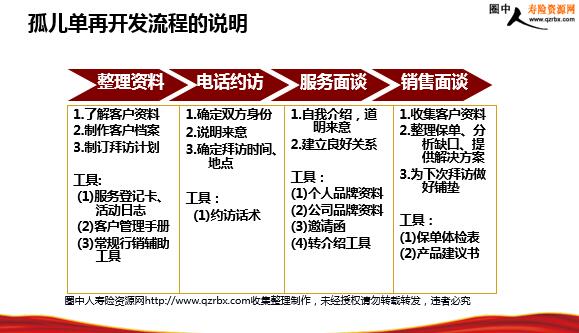 孤儿单客户再开发 纲要 1-1问题及启发 实际情况告诉我们,目前续期渠道新单保费主要来源于新客户开发,孤儿单客户资源未得到有效利用!请问您所签下的新单中有多少是来自于孤儿单客户再开发呢? 对公司:赢得口碑、巩固现有市场 对客户:完善保障、体验优质服务 对专员:提高收入、实现自我价值 1-2孤儿单再开发意义 共创三赢! 纲要 2-2推动举措 1、提升续收专员活动量 2、提高客户服务质量 3、提升自身展业技能 提升活动量 1、每日基本活动量要达到6访以上,合理安排续期收费拜访和新契约招揽拜访; 2、每月电话拜访次月全部应收件客户,如电话联系不上,则必须于月末前登门拜访,引导客户在应收当月缴纳保费; 3、对有退保意向的客户,应积极主动开展退保解劝工作,在保单垫交或停效前,应登门拜访两次以上; 4、保单自动垫交或停效后半年内,应登门拜访两次以上,说服客户及时办理还垫或复效。 提升服务质量 1、针对孤儿单客户,提供续收标准化服务,落实每年三访; 2、针对优质孤儿单客户,提供超值续收服务。超值续收服务包括:(1)日常交流,排忧解难(2)生活百科彩页、书籍杂志赠送(3)节日礼品馈赠 …… 提升展业技能-再开发对象 1、孤儿单客户本人; 2、孤儿单客户的家人; 3、由孤儿单客户转介绍的客户。 提升展业技能-再开发时机 1、给付或理赔时2、新险种上市时 3、重大节假日时4、添丁进口时 5、吉星高照或时来运转时 6、客户回访、保单体检时 …… 重要提示:能否把握第二单的开发时机,关键要看我们对客户的信息知道多少,这反映了我们与客户的交往程度,以及客户对我们的信任度。客户对我们的信任和支持,是支撑我们收展事业的根基。 提升展业技能-再开发思路 1、增加原保单的保额 2、完善保障的范围 3、扩大保障人群,争取转介绍 4、灌输投资理财的观念 5、教给节税避税、合法转移财产的诀窍 6、与提升后的职务或身价相符 7、满足不断提高的生活质量的需要 …… 重要提示:保单体检表是最好的切入工具!