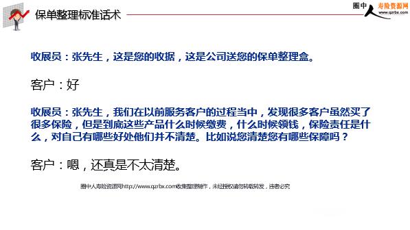 保单整理的流程工具话术及演练 保单体检的概念及重要性 保单整理的流程 保单整理话术及演练 目录 CONTENTS 保单整理的概念及重要性 PART 01 保单体检是指收展员利用标准化工具,针对购买过保险的老客户,对其保单进行检查,藉此挖掘客户的保险缺口,并进一步进行补充和保单加保。 什么是标准化保单体检? xx人寿 标准化保单体检的重要性? 客户需要 重新审视保单条款与内容,了解自身权益,及时修正基本资料,获取后续客户服务; 重视保单的变现功能,及时获取满期金、生存给付金,调整合适保障额度,科学配置家庭保障; 整合家庭保单,最佳运用保费预算。我们也需要 体现专业标准化服务,提升客户满意度,创造机会一对一面谈,进行无压力销售; 提高保单持续率,提升继续率奖金和长期服务奖金,获得加保机会; 获得转介绍名单,获取准增员名单,以服务扩影响,抢占市场及客户资源。保单整理的流程 PART 02 标准化保单体检的流程 PART 04 保单整理话术及演练 保单整理前电话约访 收展员:张姐,您好,我是****,您的保费昨天已经转账成功了,我把收 据给您送过去,您看您是周一还是周二方便? 客户:不用了,收据也没什么用。 收展员:张姐是这样的,不光是给你送收据,公司还为您准备了一份非常实用的小礼品——保单整理盒,方便您保管自己的家庭保单。那我周一下午给您带过来吧? 客户:那好吧