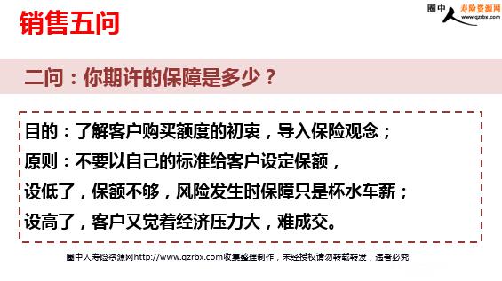 提问式营销 启动需求易促成 三种常见现状 业务员很被动,无法掌控面谈 普遍现象:业务员说得多聆听少,客户反应不大,问题多,异议多,无法解决;市场现状:很多客户咨询保险、产品对比很多、但就是不成交;客户心理:有意识,认同保险,但觉得有就行了,无法做到高保额。 能够解决的问题 通过提问,与客户互动,收集资料,更精准判断客户需求;通过提问,可以让客户了解该买什么、买多少、怎么买;通过提问,让客户懂得如何正确的合理配置家庭保障。(产品组合、家庭保单、提高保额) 更显自己的专业,而不是被客户牵着鼻子走 销售五问 您想了解哪方面的保险——筛选客户你期许的保障是多少——观念沟通您大概的预算是多少——经济评估是否有房贷、车贷,是否要赡养老人?几个孩子,孩子多大——负债,责任 5. 是否有社保福利?——锁定保额,组合产品 一问 : 您想了解哪方面的保险? 通过媒体、社会宣传、朋友圈等途径,客户对保险的重要性有了初步的了解,有买保险的意向,通过销售五问可以清楚客户的需求,买什么?给谁买?例如:重疾?医疗?教育?养老? 销售五问 逛商店的心态 当客户进店时的四种状态就是路过逛逛单纯了解看看价格看看有没有合适的明确要买的通过第一问筛选客户,了解购买意向 二问:你期许的保障是多少? 目的:了解客户购买额度的初衷,导入保险观念;原则:不要以自己的标准给客户设定保额,设低了,保额不够,风险发生时保障只是杯水车薪;设高了,客户又觉着经济压力大,难成交。 销售五问 二问:你期许的保障是多少? 客户认可保险,但对保险的认知依然是片面的,有偏差的。给客户正确的保险观念,明确保险的意义与功用,让客户知道保险该怎么买,买多少 。 销售五问 三问:您大概的预算是多少?