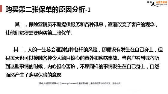 客户投保分析 前言 有些伙伴历尽周折让客户签了第一张保单之后便弃之不理,有的因为第一张是人情保单,缺乏再次拜访客户的勇气,也有的觉得客户刚刚买了第一张保单,短期内没有经济能力购买第二张,于是全身心投入下一个客户的开发。可是在某一天,当你疲于寻找新客户,希望从老客户身上发现商机时,却发现他们早已经在其他营销员那里购买了第二张,甚至是第三张保单,而且所缴保费远远高于第一张。其实,人的一生不可能只需要一张保单,每一个客户在购买了第一张保单之后,购买新保单和加保的机会会很快提上日程。 如果从客户购买的角度,就开发第二张保单而言,可以分为三种情况: 1.同一个保险营销员在同一个客户身上开发第二张保单; 2.不同保险营销员给同一个客户设计第二张保单; 3.为孤儿保单客户设计第二张保单。 人在不同的阶段所扮演的角色是不一样的,因此需要不同的保障。随着年龄的增长、家庭成员的增添、家庭责任的加大以及收入的增加,保障需求会随之增加。所以,人的一生需要好几张保单,不可能依靠一张保单来解决一生的保障问题。那么,对于同一个保险营销员而言,在同一个客户身上开发第一张保单和第二张保单有着怎样的区别? 购买第一张保单随意性较大 人情保单。为了帮助亲戚、朋友或者同事冲刺业绩,迫于人情压力购买了一份保险,往往自己也不知道买一些什么内容。营销员的坚持拜访。可以分为两种情况,一种是保险营销员没有专业经验,逮到一个客户死缠烂打,不买就天天缠着他,客户无可奈何,想尽早摆脱营销员的纠缠只好购买了一份保险;另一种情况是,保险营销员觉得保险可以帮助别人的,以此为信念坚持拜访,而且有一定的方法和技巧,最终用专业和真诚打动客户,让客户购买了一张保单。购买第一张保单随意性较大 跟风。比如客户看到同事或者邻居购买了保险,也抱着试试看的心态买了一份。主动投保。也有少数客户保险意识比较强,真正有保险需求,主动要求投保。通过保险公司举办的产品说明会或者电话行销等其他方式买了一份保险。 由此可见,客户在购买第一张保单的时候,往往考虑得更多的是人情等因素,这个时候他们对保险不太了解,保险观念也不强,对保险公司和保险营销员还没有建立起稳固的信任感,更多的是抱着试试看的心态才购买了一份保险。
