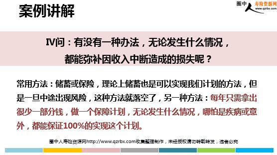 一表四问 撬动客户内心需求 医生与卖药的区别 药贩子手里有一个灵丹妙药,专治百病,看到什么人都给他推销他的药,有病治病无病防身,是不是听得非常耳熟呢,那么电视里面也常常看到这就是一个江湖骗子。而医生呢平日里默不作声,如果有病人上门就给病人望闻问切,仔细询问病人的病情,对症下药。 开门见山说产品,引起反感 绞尽脑汁想办法,无处切入 需求分析表 指导客户填写需求分析表,要求客户反馈。 1.你的收入 2.配偶收入 3.投资收入 4.家庭收入 1.生活开支 2.子女教育 3.人情世故 4.按揭贷款 5.聚会花销 收入?支出 四个问题 你是否想过万一有一天收入中断? 什么情况发生会导致收入中断? 收入中断将带来怎样的经济损失? 如何规划才能弥补这部分经济损失? 案例讲解 张先生,31岁,三口之家,夫妻双方都是企业职工 儿子3岁,家庭年收入15万元。 张先生需求分析表 家庭收入:156000元 家庭支出:131200元 收入略大于支出 准月光族 案例讲解 问:那你有没有想过万一有一天你的收入突然中断? 问:什么情况下收入会中断? 问:收入一旦中断对于你或者家庭会造成那些损失? 张先生的潜在风险 家庭支出:131200元/年 房贷剩余:120000元 治疗费用:200000元 其他:100000元 合计:551200元 案例讲解 Ⅳ问:有没有一种办法,无论发生什么情况, 都能弥补因收入中断造成的损失呢? 常用方法:储蓄或保险,理论上储蓄也是可以实现我们计划的方法,但是一旦中途出现风险,这种方法就落空了,另一种方法:每年只需拿出很少一部分钱,做一个保障计划,无论发生什么情况,哪怕是疾病或意外,都能保证100%的实现这个计划。