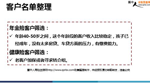 看好时机巧成交 批量收获家庭单 年金险客户筛选:年龄40-50岁之间,这个年龄段的客户收入比较稳定,孩子已经成年,没有太多房贷、车贷方面的压力,有缴费能力。健康险客户筛选:老客户加保或者寻求转介绍。 客户名单整理 重疾新规广而告之 在朋友圈里发布重疾新规的消息,说明时隔13年的重疾新规大改革,这个期间投保可以享受“择优理赔”。 家庭单销售展示 合计3件,保费12274元 合计2件,保费8788元 家庭单销售展示 家庭单销售案例分享 客户来源:老客户转介绍职业背景:90后,因为孩子小无法上班,全职在家带孩子风险分析:家庭收入来源比较单一,仅靠爱人收入,做为家庭的顶梁柱,急需一份保障。 获取转介绍名单 老客户:自己的外甥女,之前为老公买过健康险,中间曾经发生过理赔,对于xx的直付速赔非常认可;获取转介绍:重疾新规发布,新老产品过渡到本月31日,看看你身边有没有需要买保险的人,给我介绍一下吧! 初识转介绍客户 认识第一位转介绍客户,添加微信;经了解,客户为90后,保险意识较强,想给孩子买保险;初步微信沟通,了解初步情况,寻求面见机会。 重疾新规介绍 xx人寿推出了“择优理赔” ,简单说就是“哪边好就赔哪边”,一定是要尽快办理呢! 产品亮点介绍 “xx有一款性价比高的产品,臻爱倍至,很适合你们,低保费,高保障,多次赔付,不仅病种全,还增加了创新型中症,一次投保,建立长久保障。” 保险早买晚买都得买,今天就给家人送上一份保障吧!